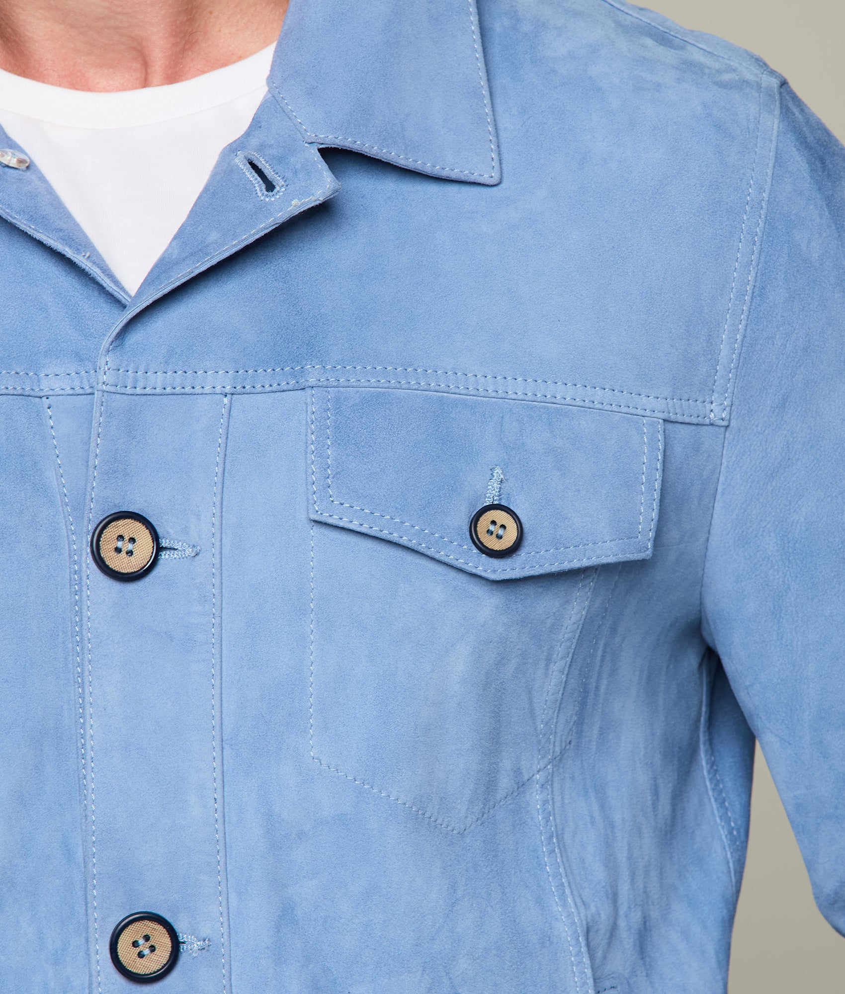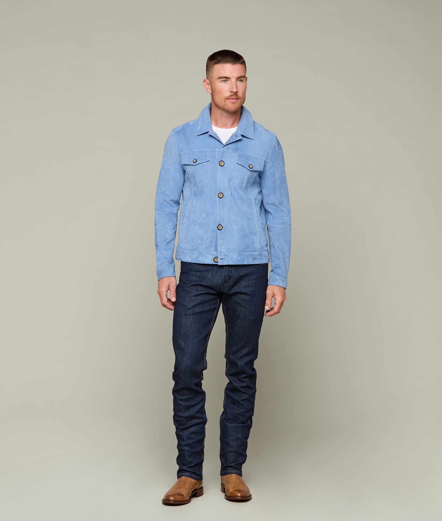 The Big Sky Jacket is a nod to the open skies of the West. Made from the most supple Goat Suede in muted tones of blue. this piece exudes modern flair with a touch of classic Americana. Whether worn over a plaid shirt for a casual outing or layered with knitwear for a crisp morning. this jacket promises to elevate any wardrobe with its understated elegance.
