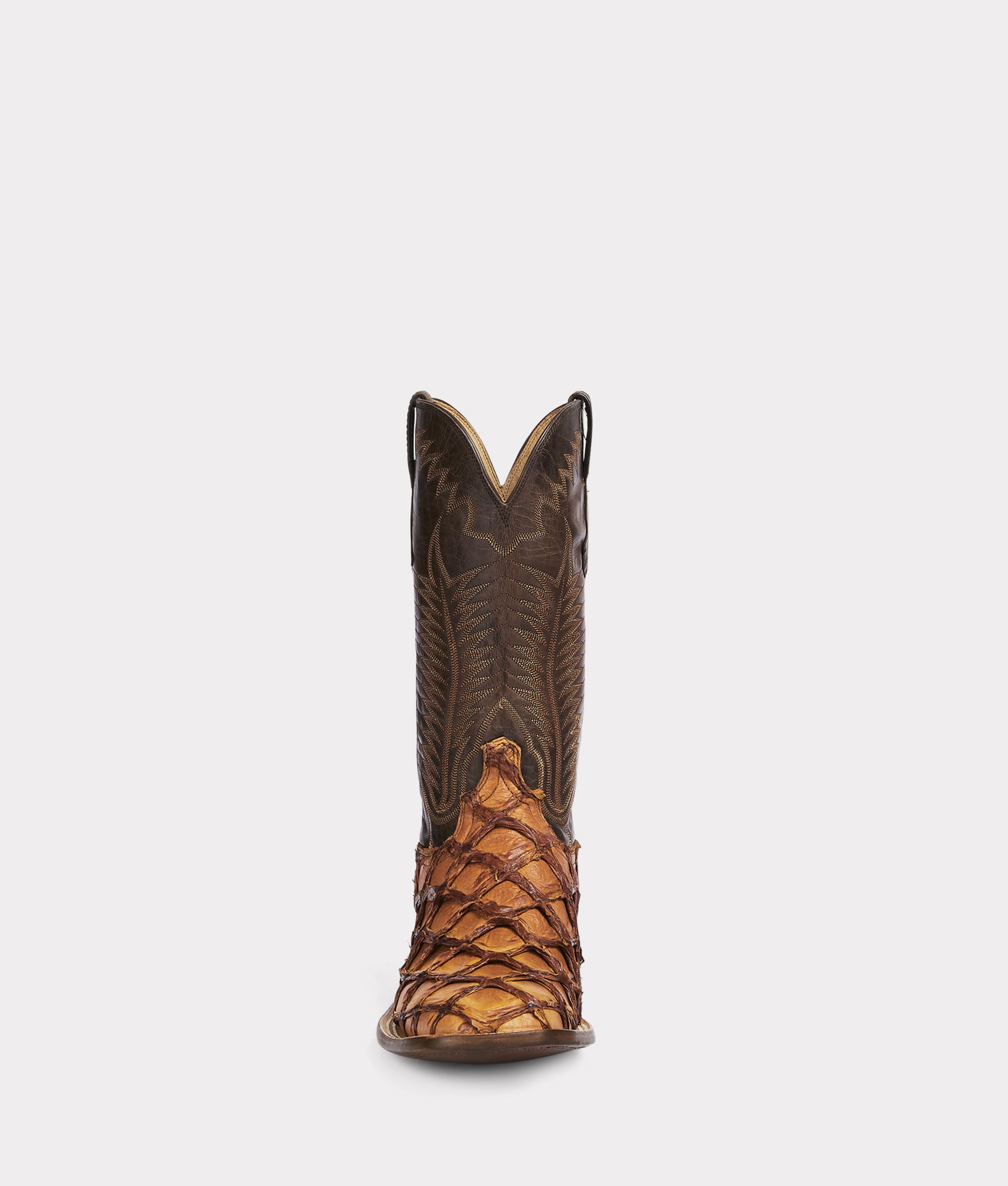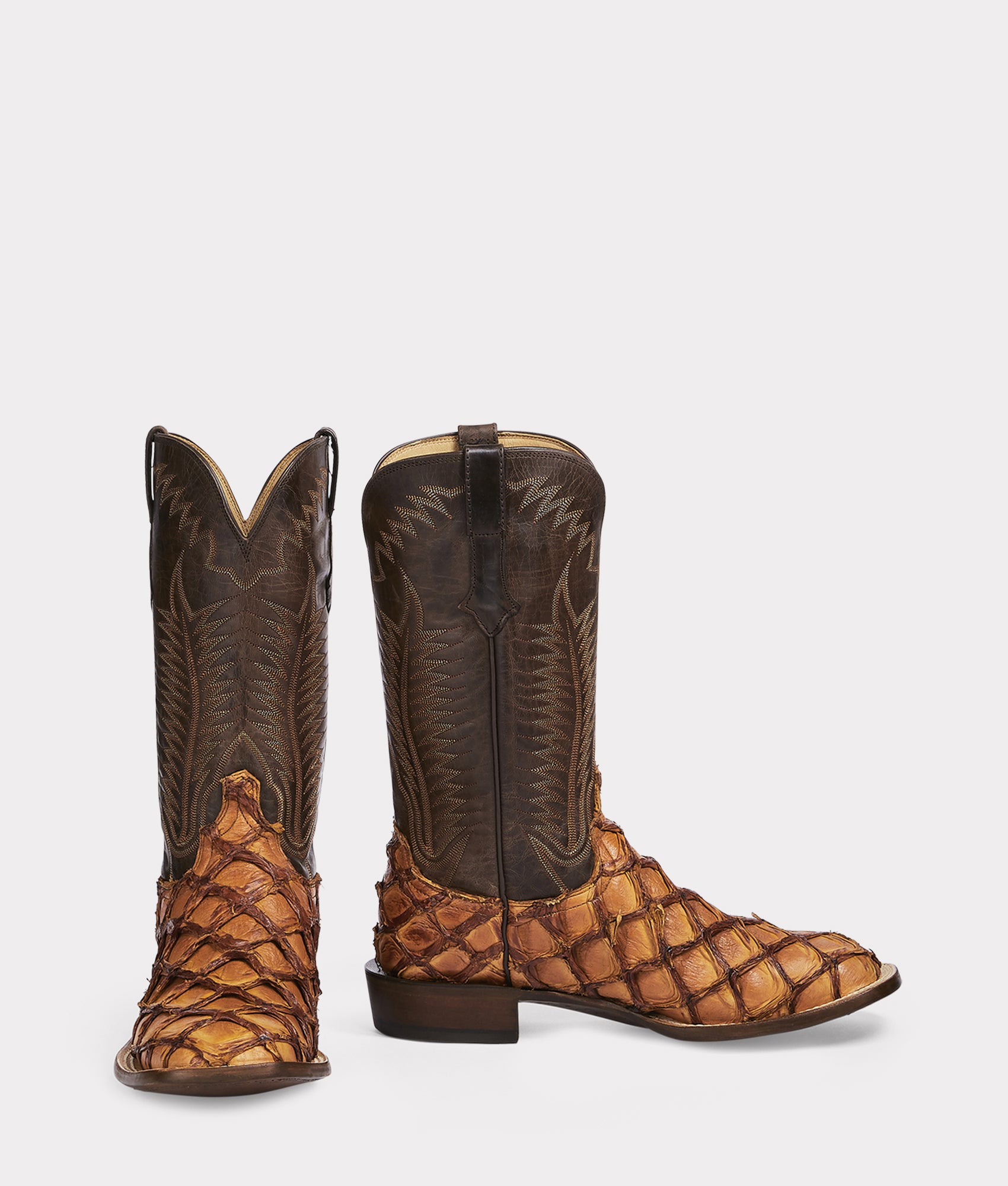 Crafted from hand stained Pirarucu fish. the Brooks is wild and untamed. A spur-ridged heel acts as a ledge to prevent jeans from dragging as well as an ideal resting spot for your lucky pair of spurs. With every horse ridden and every step taken. the Brooks will have you hooked. Handmade in Texas.