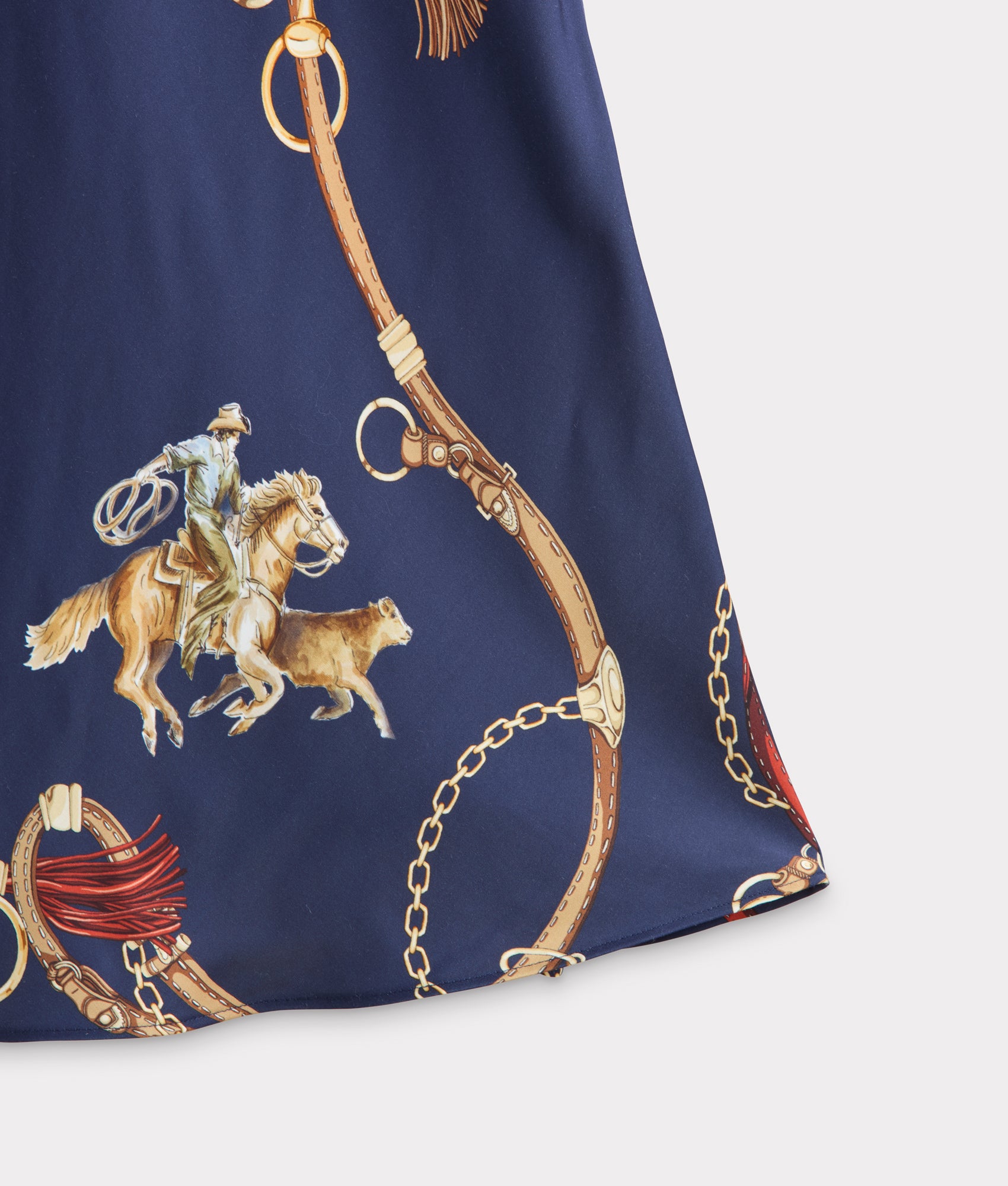 The Caroline Skirt showcases a distinctive Western-inspired design with a vibrant print featuring bucking horses. tassels. and lassos. The pattern is rendered in natural tones. blending earthy browns. soft beiges. tans. and blues to create a visually striking yet versatile piece. The Caroline Skirt offers an adventurous spirit to any repertoire.
