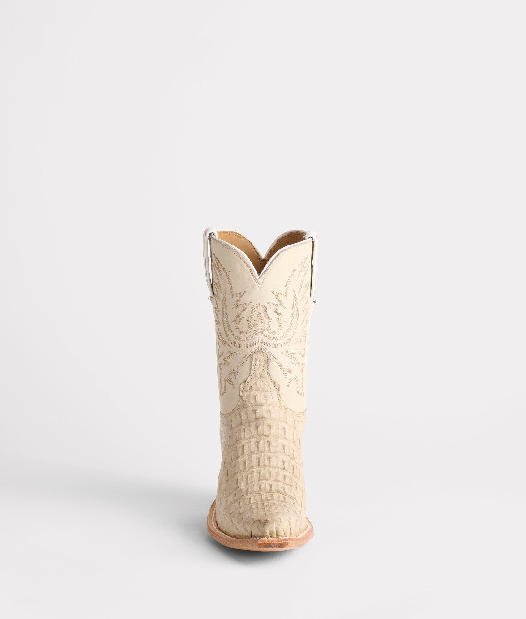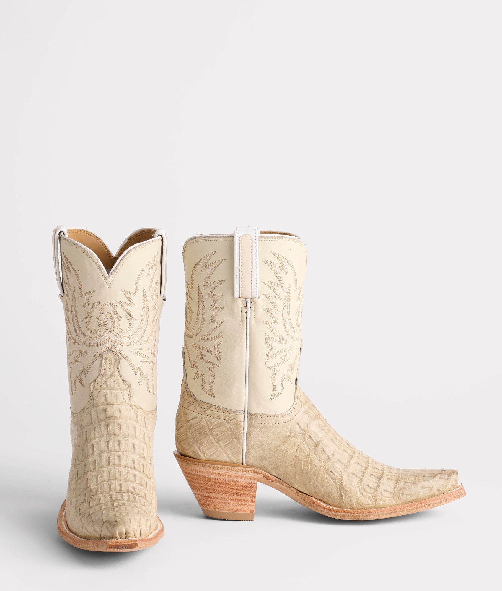The Dale Exotic is an exciting fashion statement. It brings together coveted Hornback Caiman and smooth Goat leather for a look that’s retro inspired but refreshingly current. The 9-inch quarters are a little shorter than many cowgirl styles; a 2-inch heel that lends a little overall height. The New Leaf stitch pattern nods to Western motifs. Under dresses or over jeans. Dale Exotic turns heads. Handmade in Texas.
