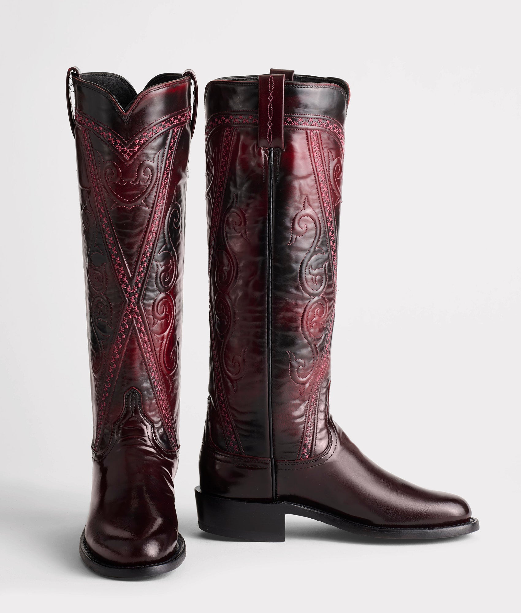 Dora is a vintage-inspired roper adorned with a Stovetop scallop design and classic hand stained Santini Goat leather. Dora pays homage to Lucchese’s rich equestrian heritage – a maneuverable roper heel and 16-inch tall quarter are intended for riding. Fashion and function ready. Handmade in Texas.
