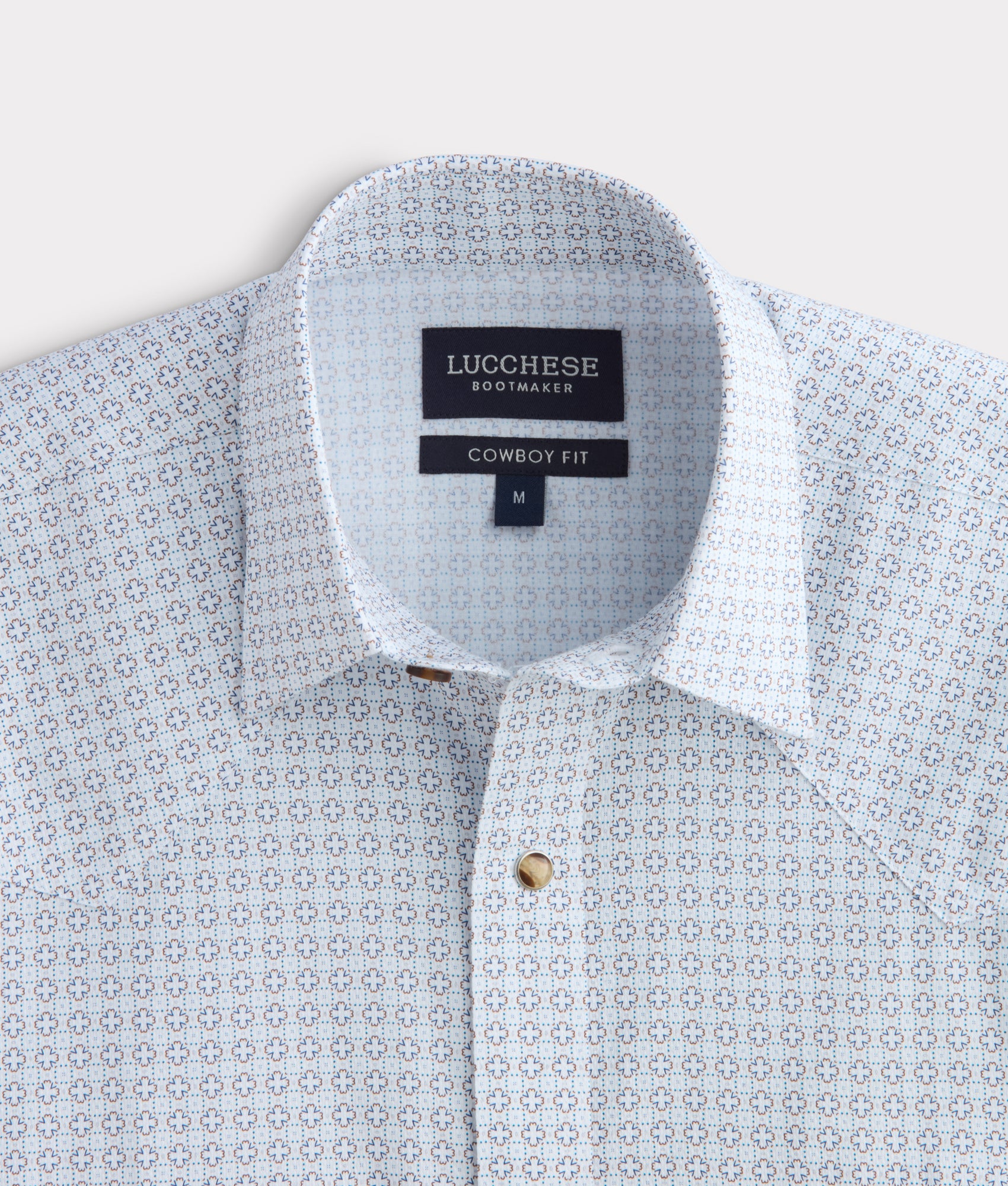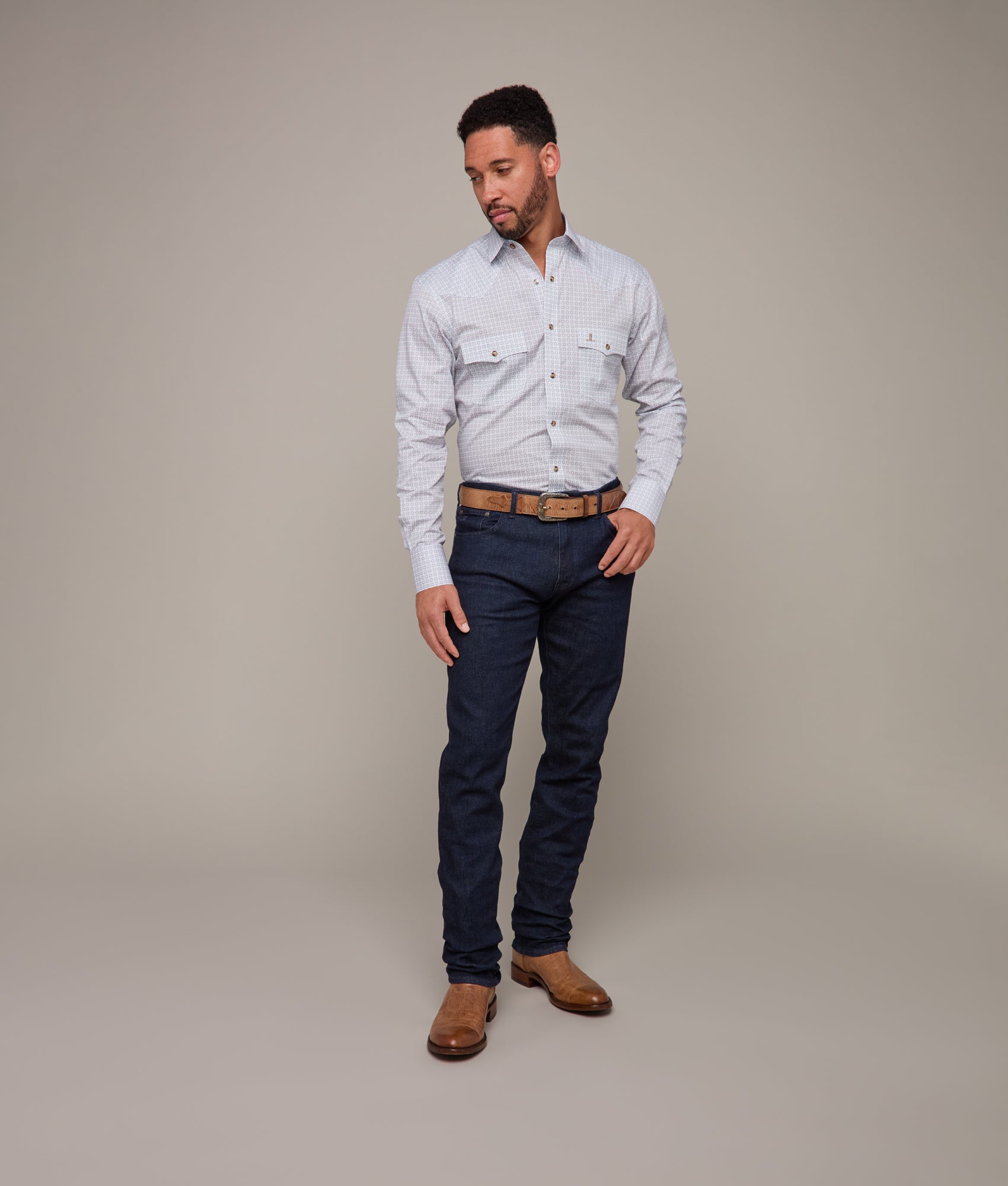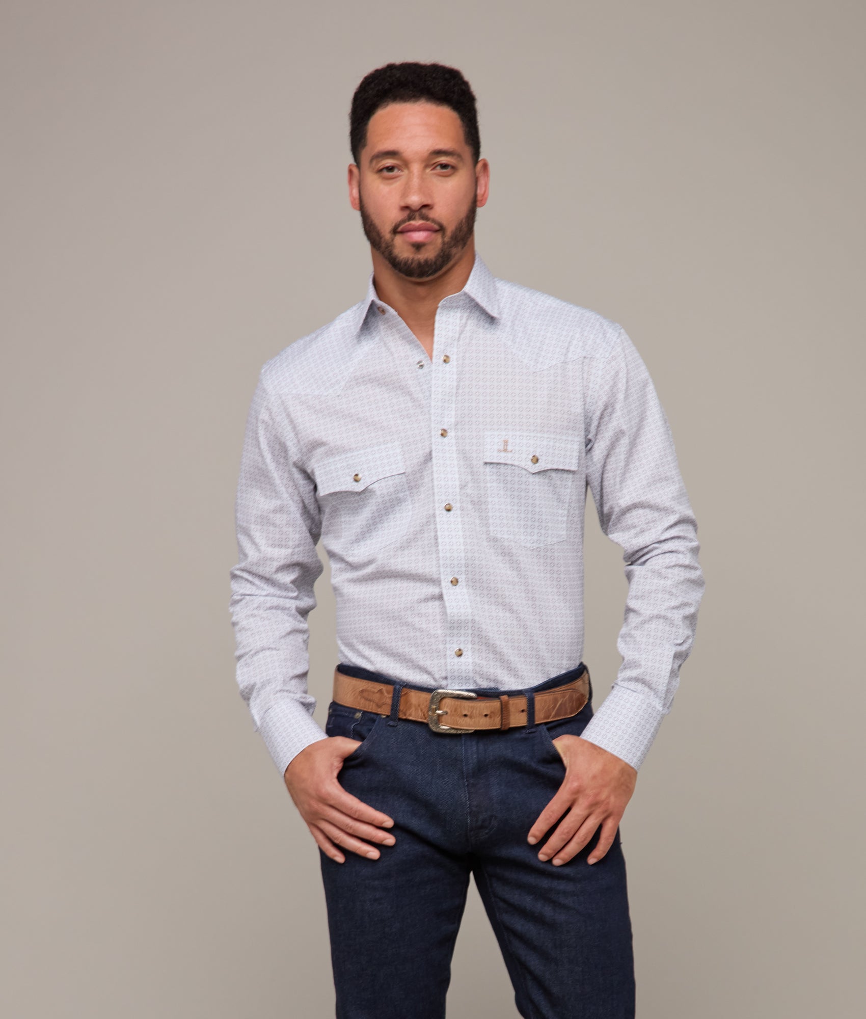 Named for our El Paso factory. this rugged. cotton western shirt features a cowboy yoke in front and back with a subtle. embroidered mirrored-L emblem on the left pocket and lower placket. Classic cowboy fit.