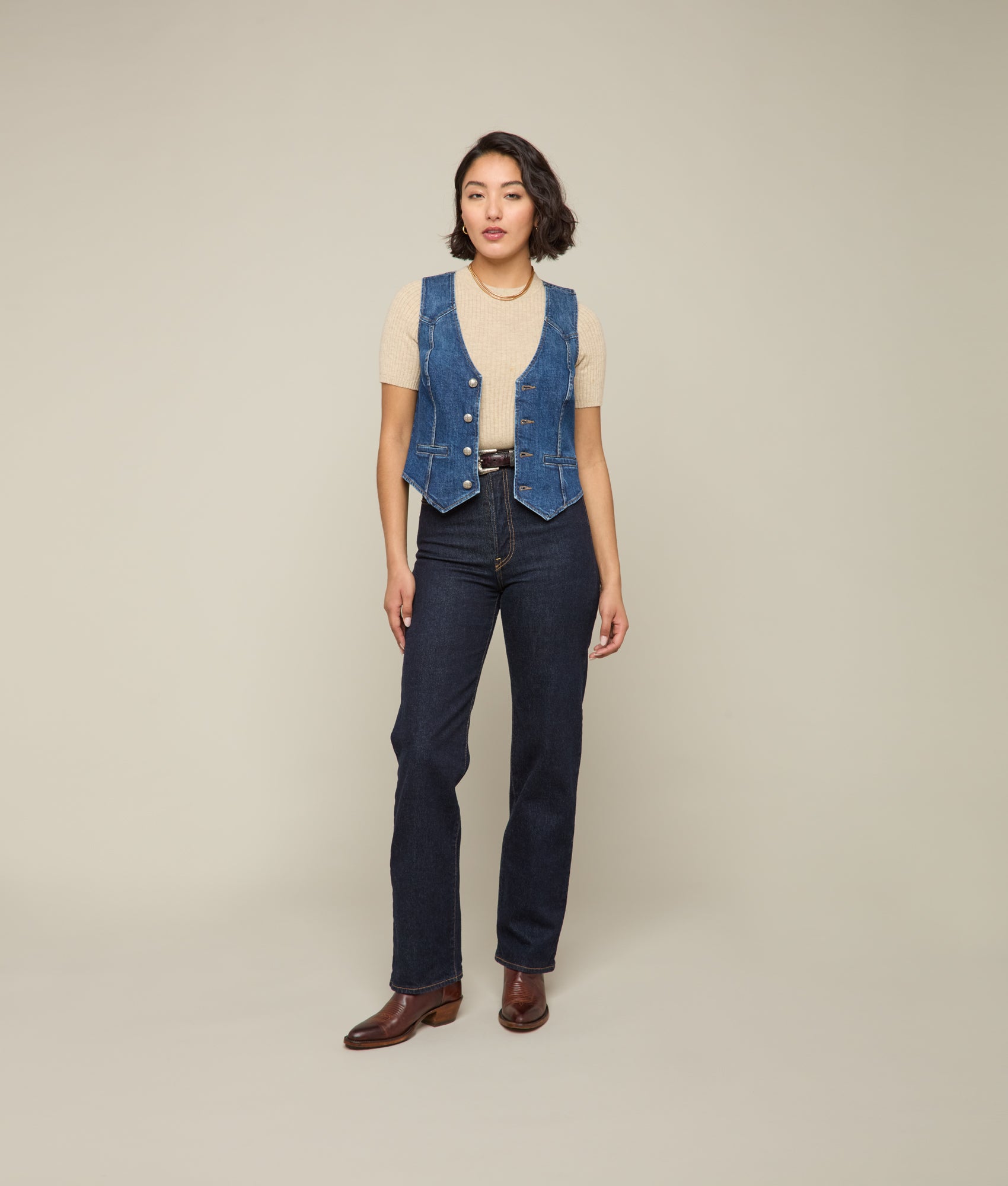 Riley’s aesthetic is showstopping. Worn by itself or over a shirt. this sleeveless silhouette offers that classic button-down front. detailed hemwork. and a stonewash finish. The Riley is highlighted with a shoulder and back western yoke ?C tipping her hat to the gals. she’s saying howdy and see y’all later too.