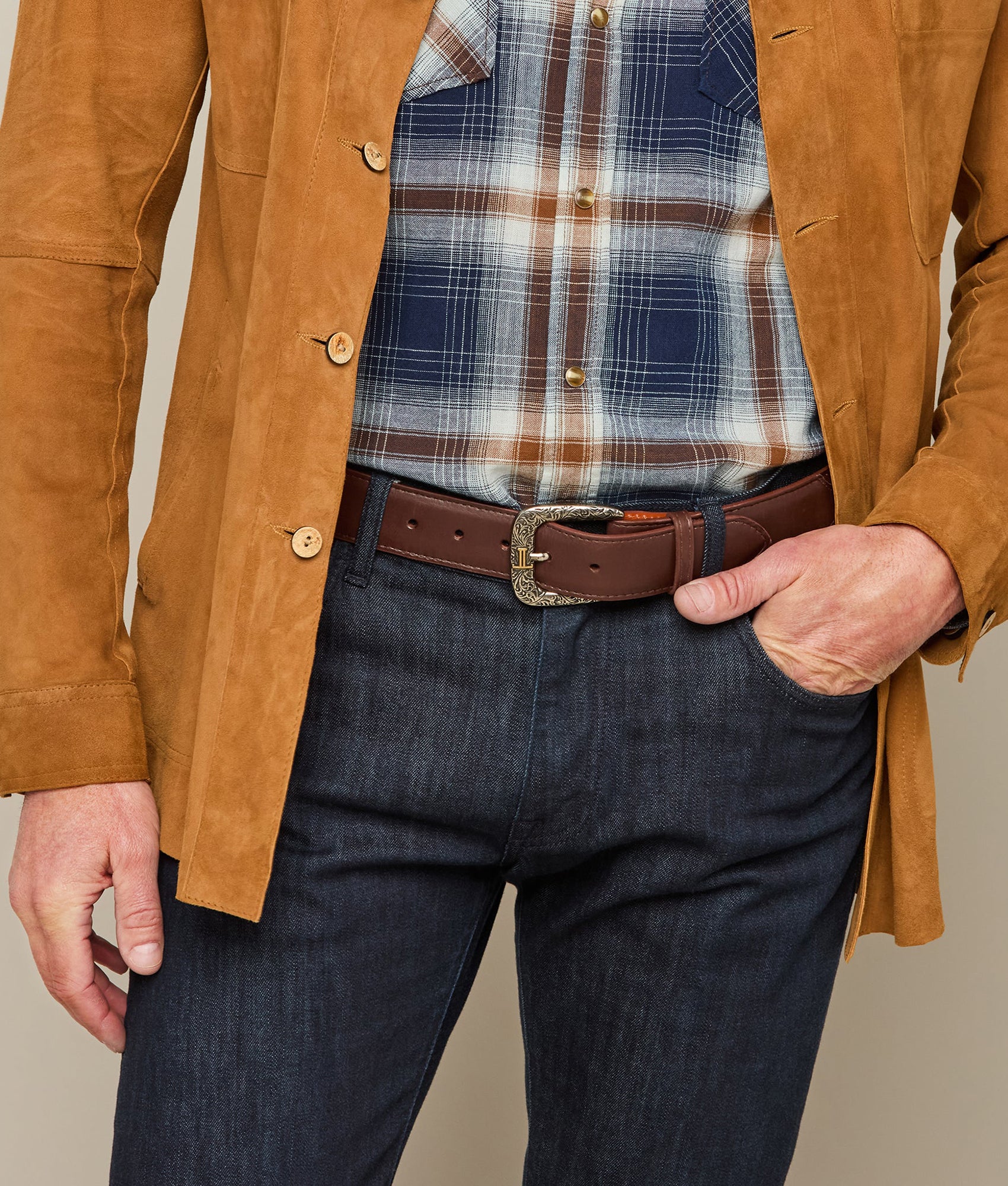 Lucchese men’s belt made with baby buffalo leather. Lucchese craftsmen use a unique polish method that create different hues and add texture to the leather. giving it a vintage look. Made with buffalo leather. this belt is thick and has good durability. Its Southwest buckle add style and versatility to this classic men’s belt. Handmade in Texas. 1.5 wide Removable buckle