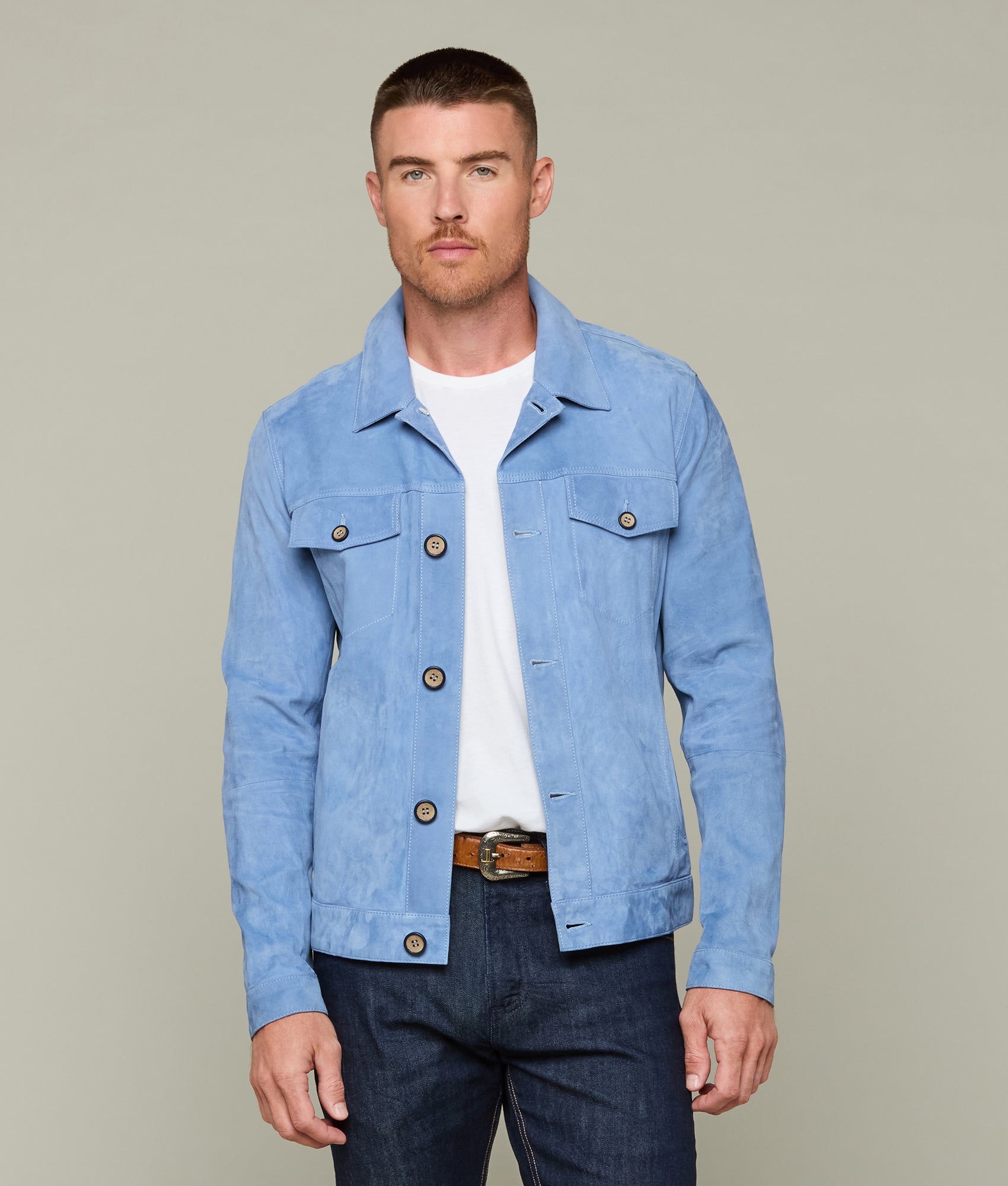 The Big Sky Jacket is a nod to the open skies of the West. Made from the most supple Goat Suede in muted tones of blue. this piece exudes modern flair with a touch of classic Americana. Whether worn over a plaid shirt for a casual outing or layered with knitwear for a crisp morning. this jacket promises to elevate any wardrobe with its understated elegance.
