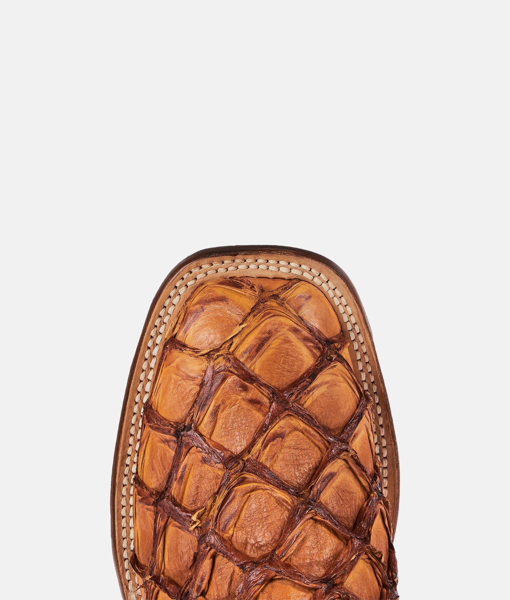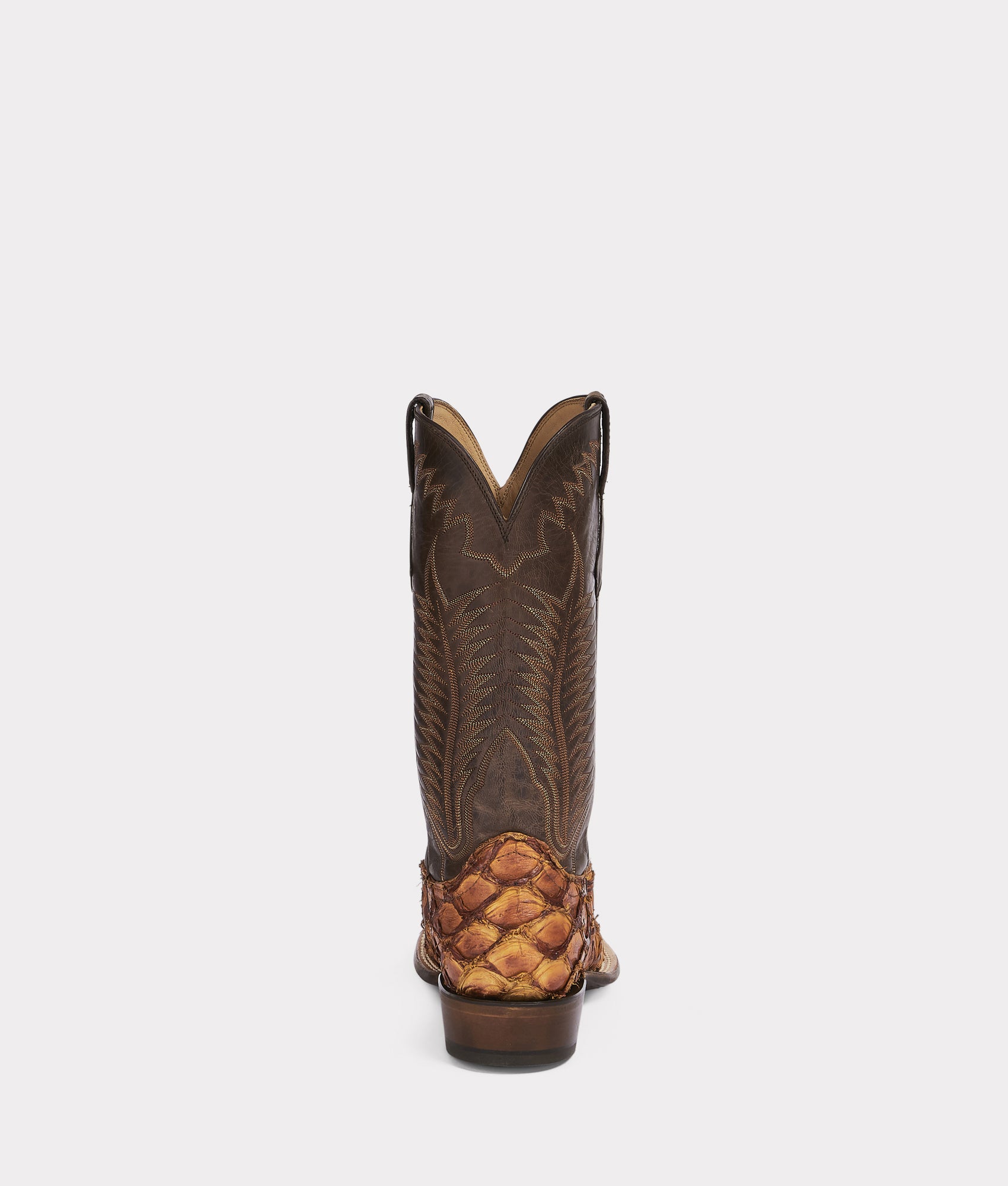 Crafted from hand stained Pirarucu fish. the Brooks is wild and untamed. A spur-ridged heel acts as a ledge to prevent jeans from dragging as well as an ideal resting spot for your lucky pair of spurs. With every horse ridden and every step taken. the Brooks will have you hooked. Handmade in Texas.