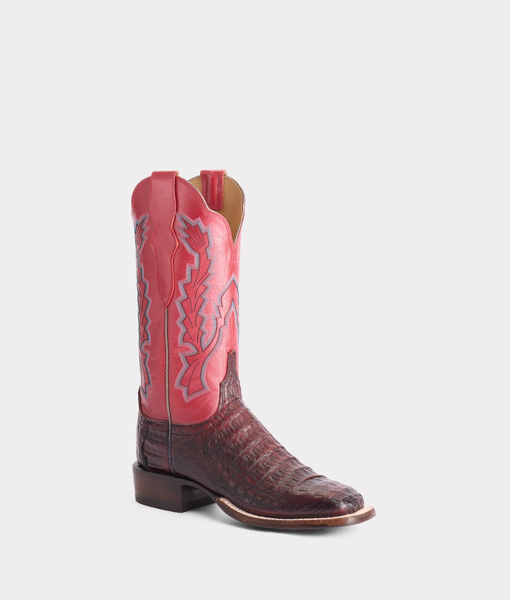 Reminiscent of traditional cowgirl culture. but with a twist. the Brynlee Exotic showcases jaw-dropping tones Hornback Caiman. Contrasting Goat quarters cut with an Elegante scallop bring this silhouette to life. Hand-cut and crafted by our coveted Lucchese artisans. this horseman square toe has been lit by the torch from 140 years of passed down. time-honoring artisanship. Handmade in Texas.
