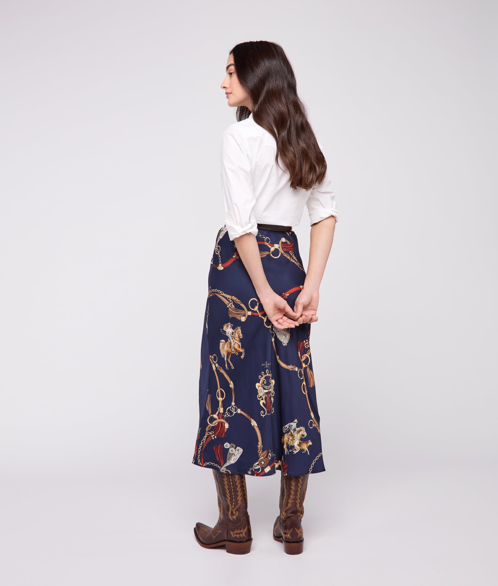 The Caroline Skirt showcases a distinctive Western-inspired design with a vibrant print featuring bucking horses. tassels. and lassos. The pattern is rendered in natural tones. blending earthy browns. soft beiges. tans. and blues to create a visually striking yet versatile piece. The Caroline Skirt offers an adventurous spirit to any repertoire.