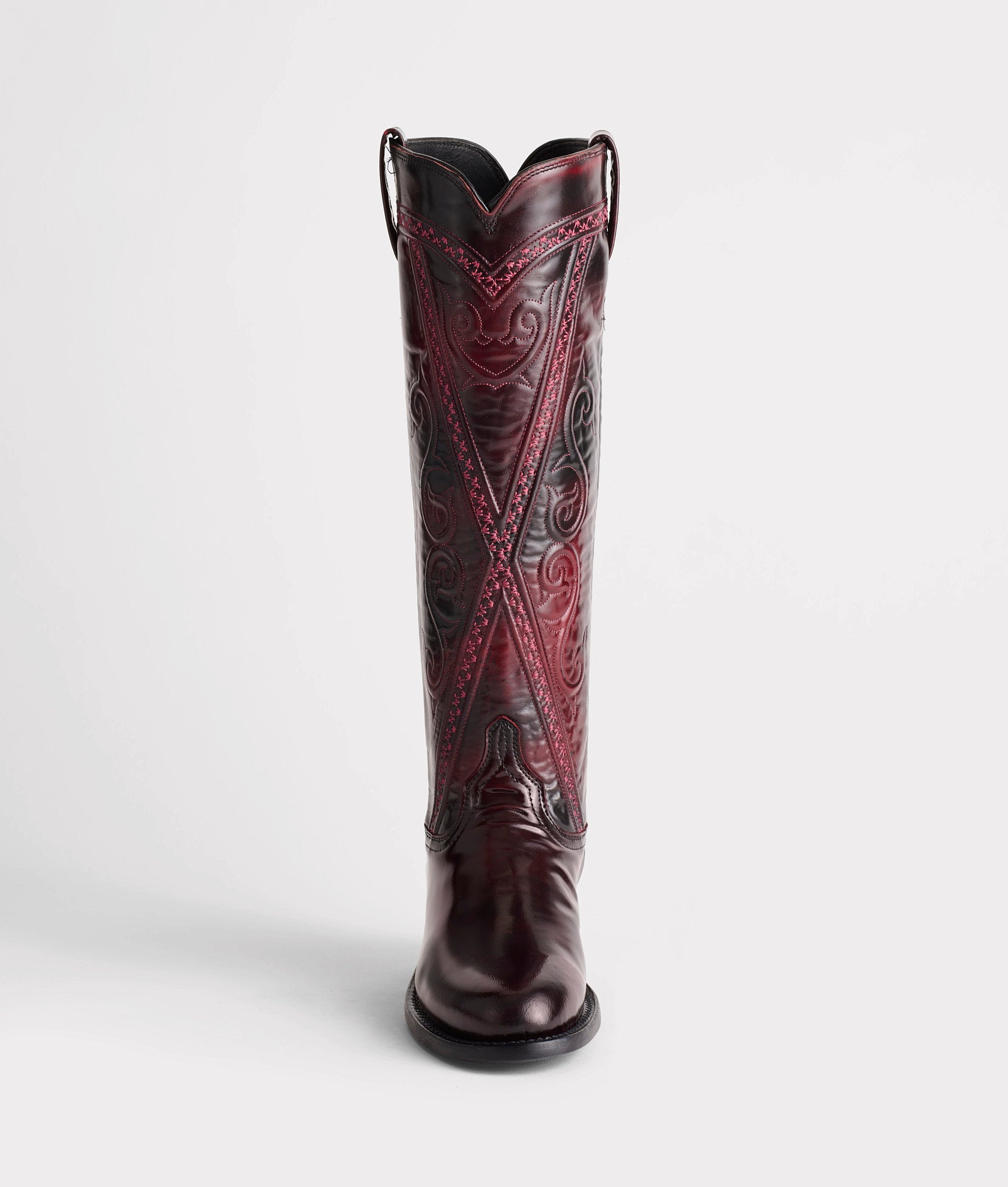 Dora is a vintage-inspired roper adorned with a Stovetop scallop design and classic hand stained Santini Goat leather. Dora pays homage to Lucchese’s rich equestrian heritage – a maneuverable roper heel and 16-inch tall quarter are intended for riding. Fashion and function ready. Handmade in Texas.