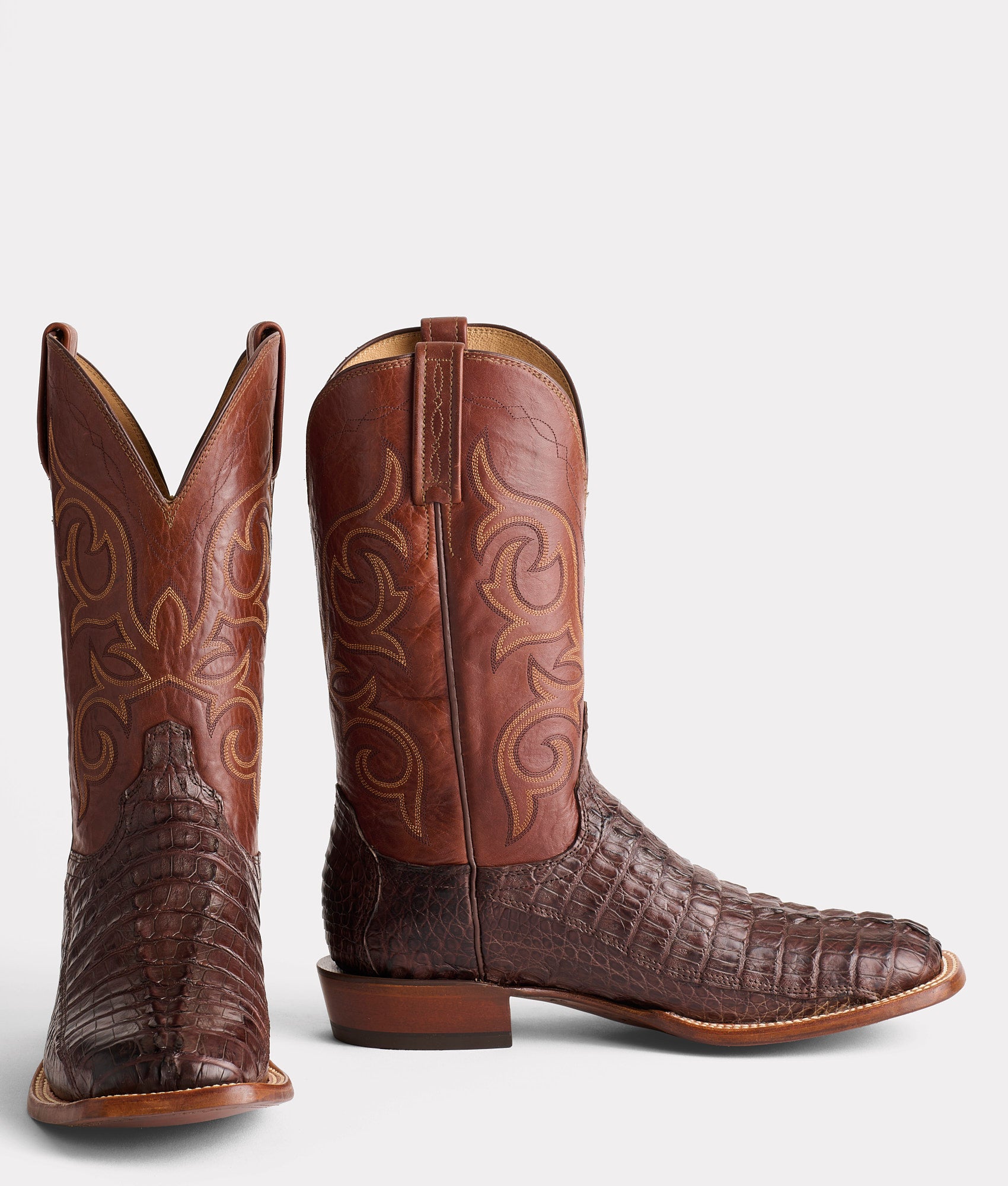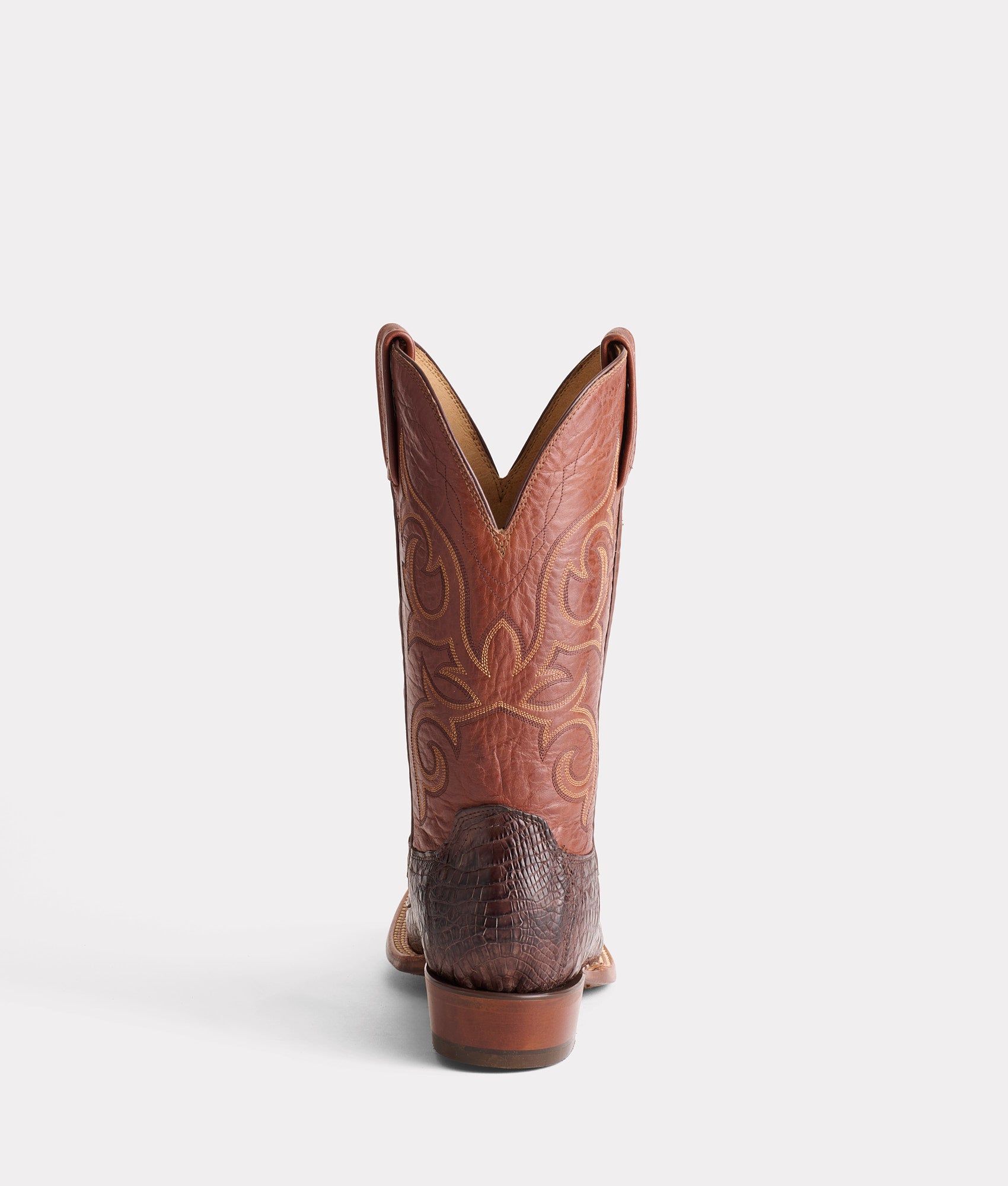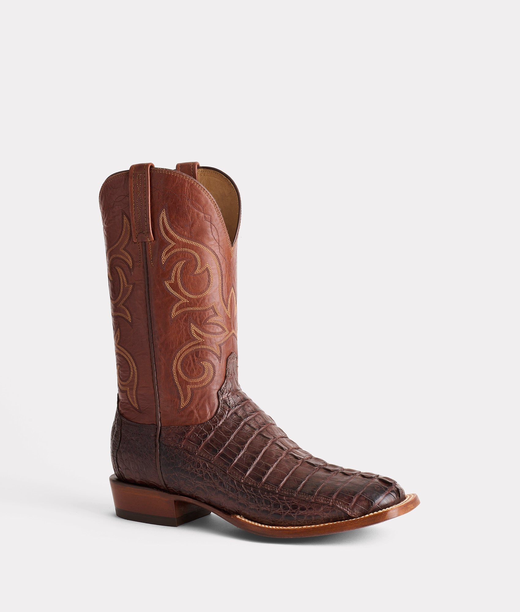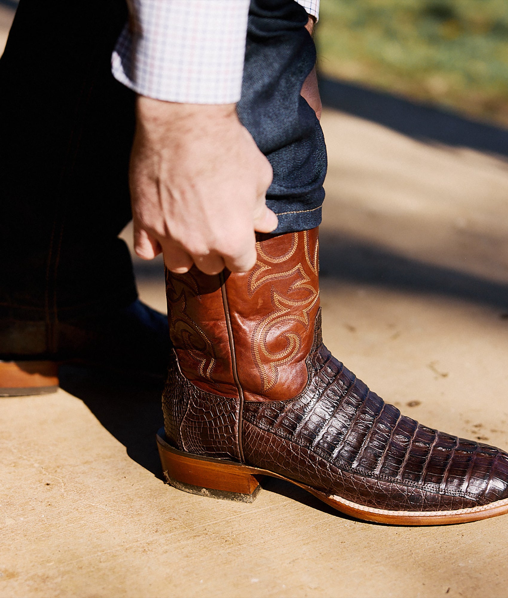 The Haan is an exotic horseman silhouette with a?spur-ridged heel?that exudes rustic poise from sole to scallop. Front to foxing. the Haan is fashioned from Hornback Caiman Tail – a textured look and feel to break up the monotony of a day-to-day ensemble. Handmade in Texas.