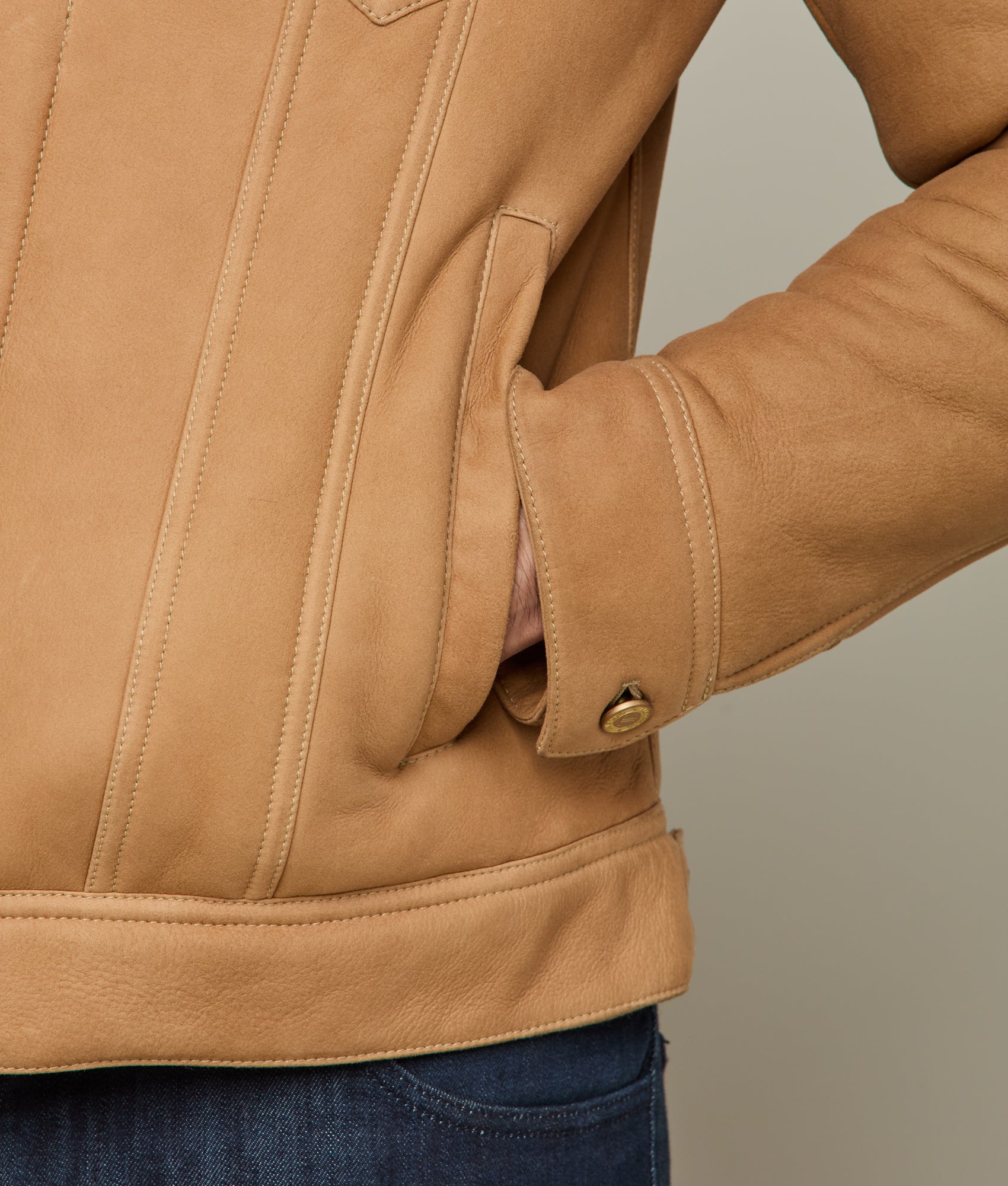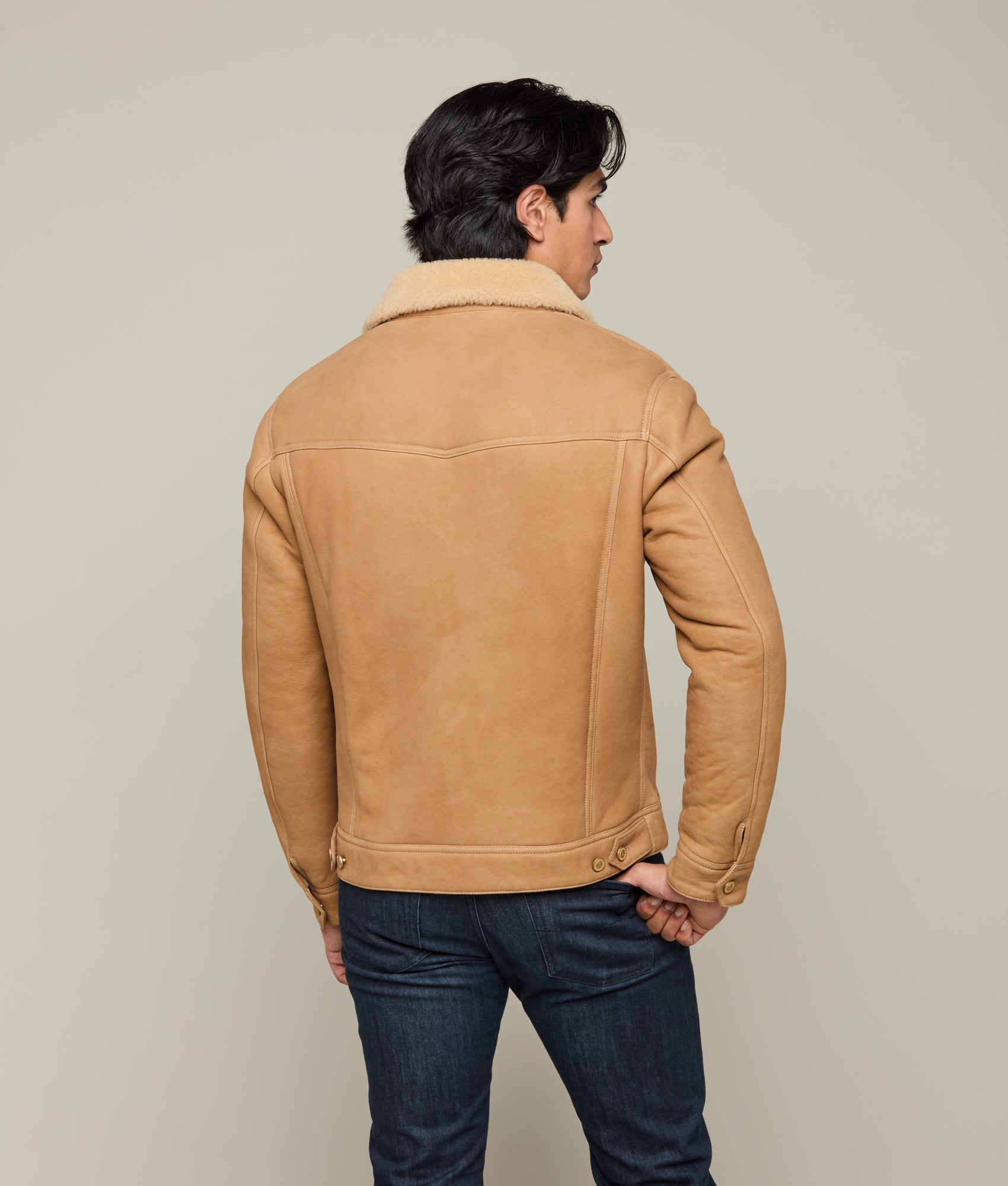 Crafted with meticulous attention to detail. the Shearling Trucker Jacket epitomizes sophisticated elegance. Its robust silhouette boasts a dual chest pocket arrangement. offering both functionality and style. Frontal buttons seamlessly integrate into the jacket’s design. complementing the structured shearling collar that defines the neckline. This rustic piece is a necessity during the colder months.