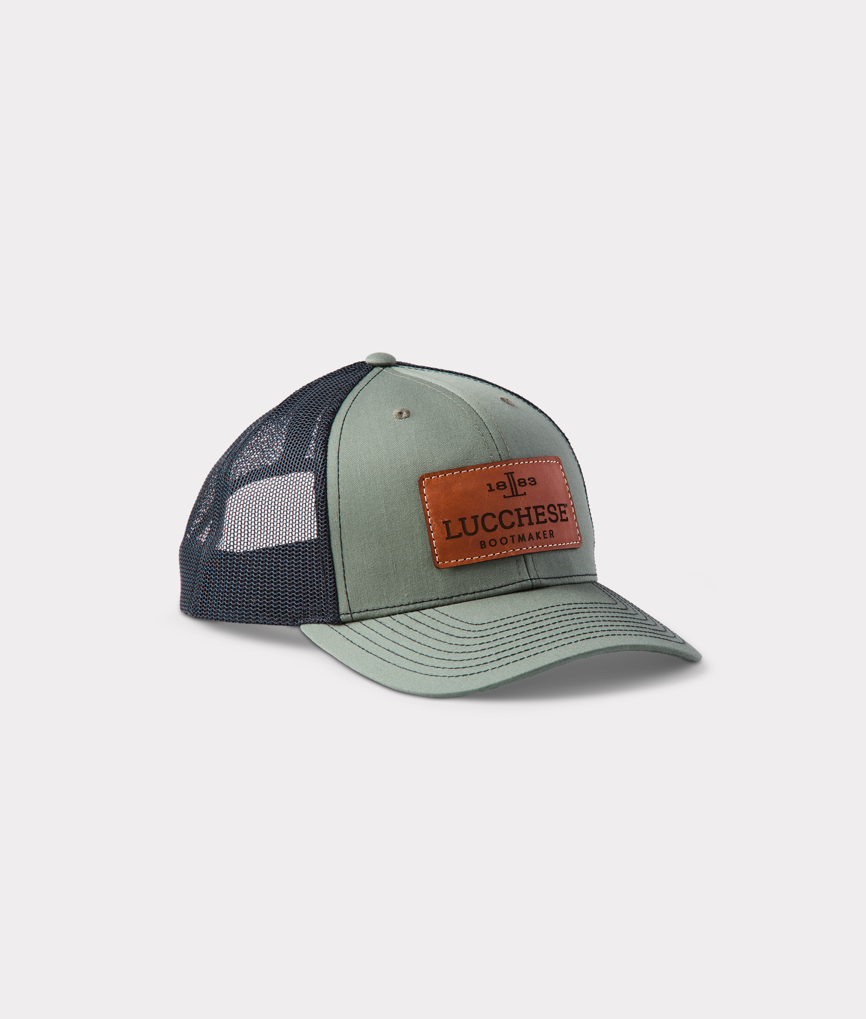 The Lucchese Leather Patch Cap has breathable mesh and an adjustable snap closure. Lucchese Bootmaker logo patch on front. One size fits most.