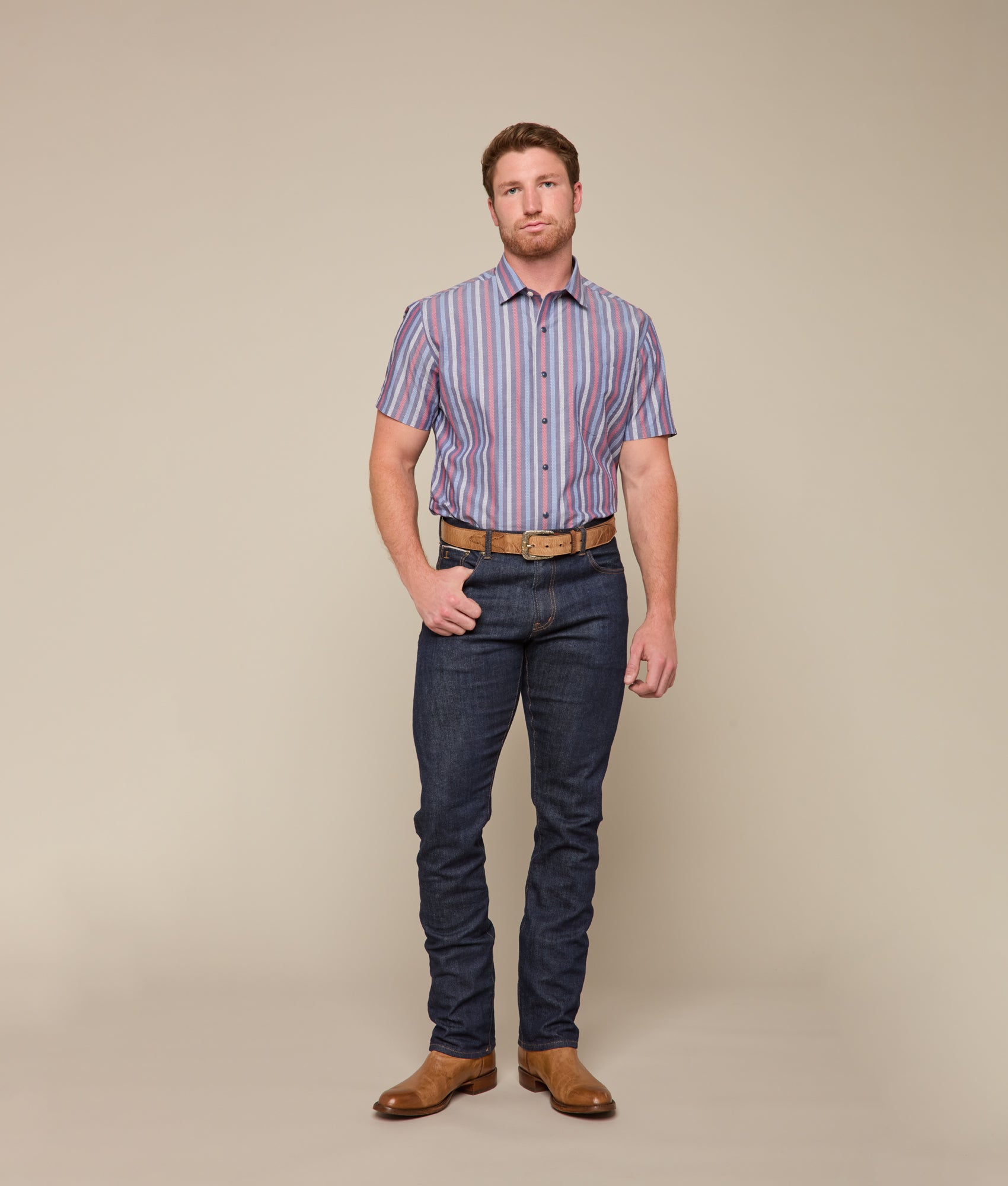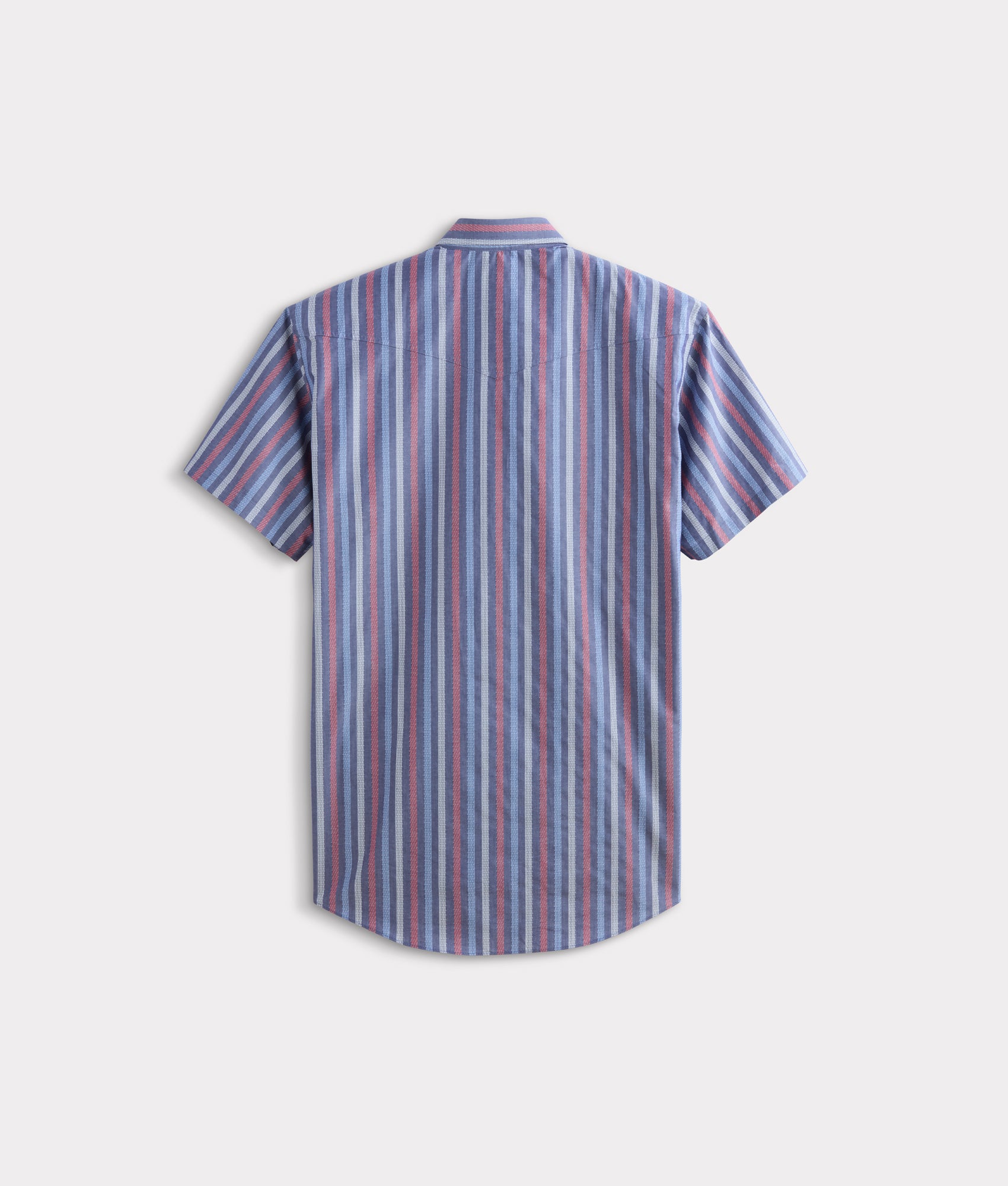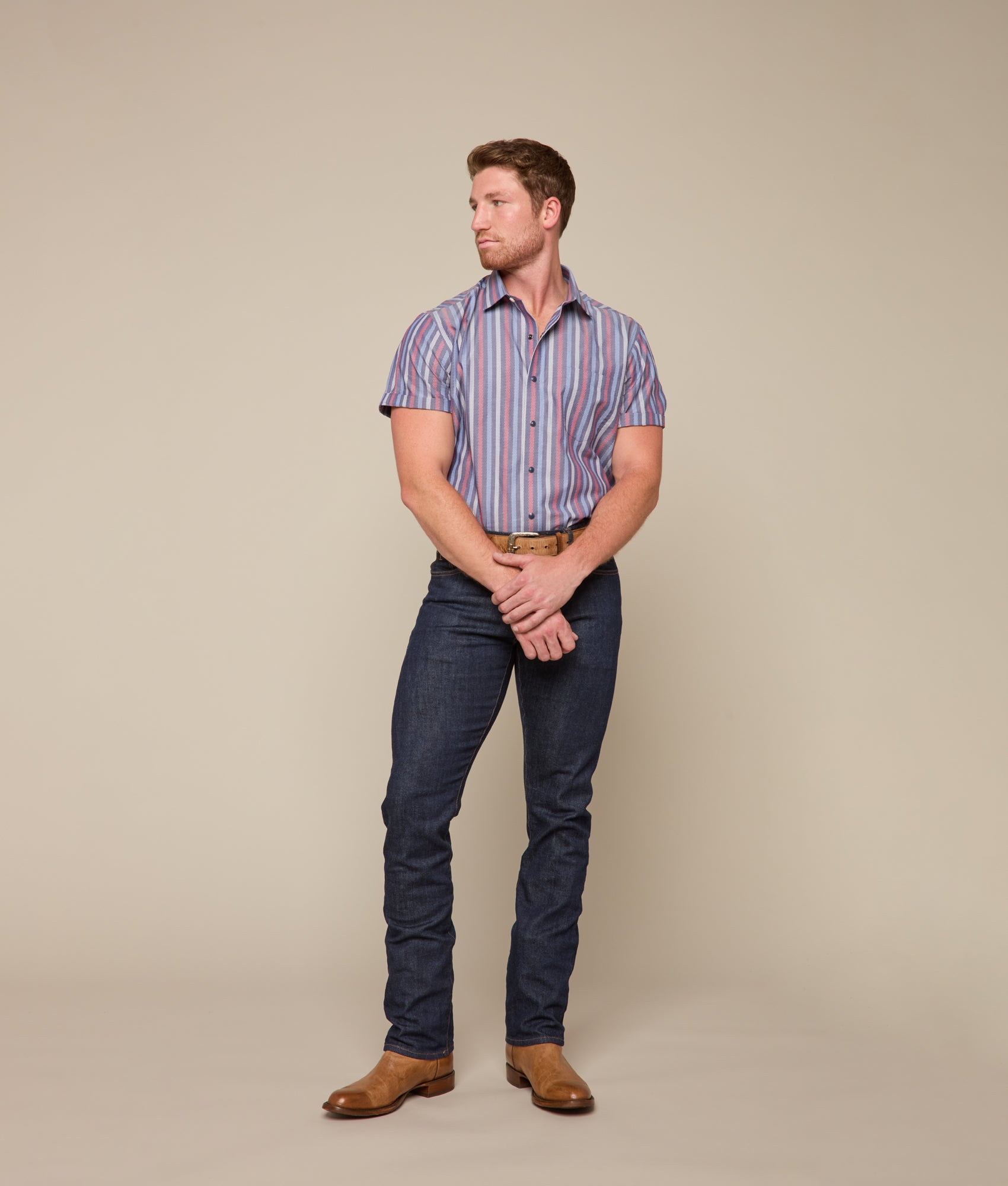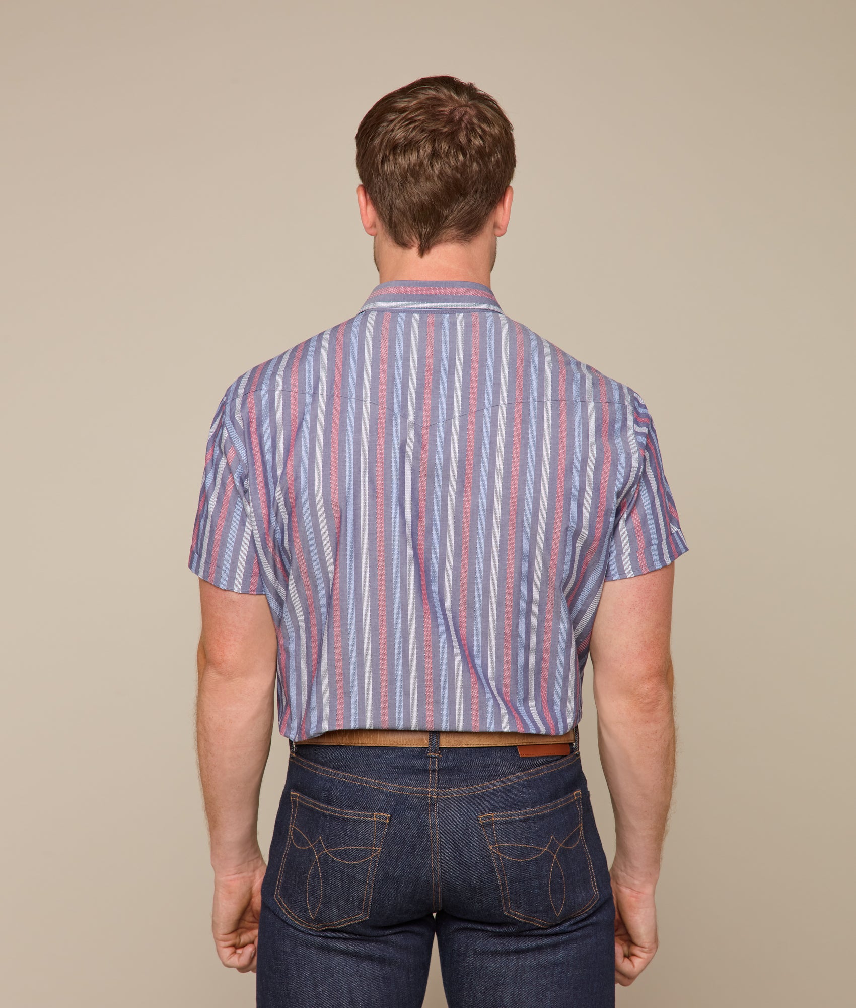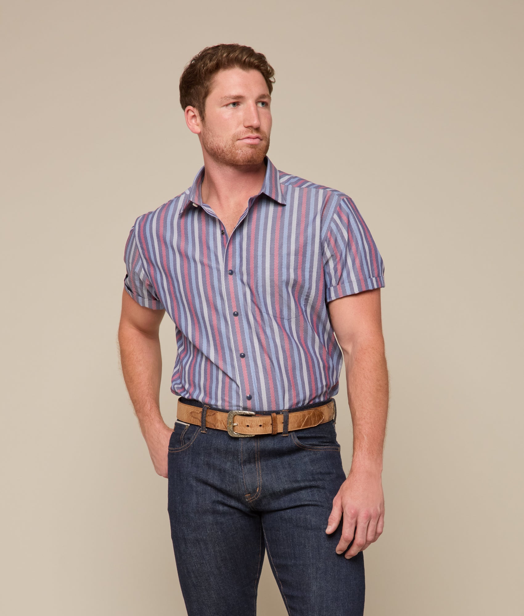 Part of the Parker McCollum collection. this short-sleeved snap shirt captures the heart of country cool. Known for his raw sound and honest lyrics. Parker brings that same authenticity to his signature style??laid-back. bold. and unmistakably Texan. This shirt features a standout stripe pattern in rich reds. deep blues. and soft greys that wrap all the way around for a clean. polished look. Parker gravitates toward this piece for its easy fit. classic western snaps. and colors echoing his music’s Texas roots. It’s the kind of shirt you can wear from the stage to the back porch??and everywhere in between.
