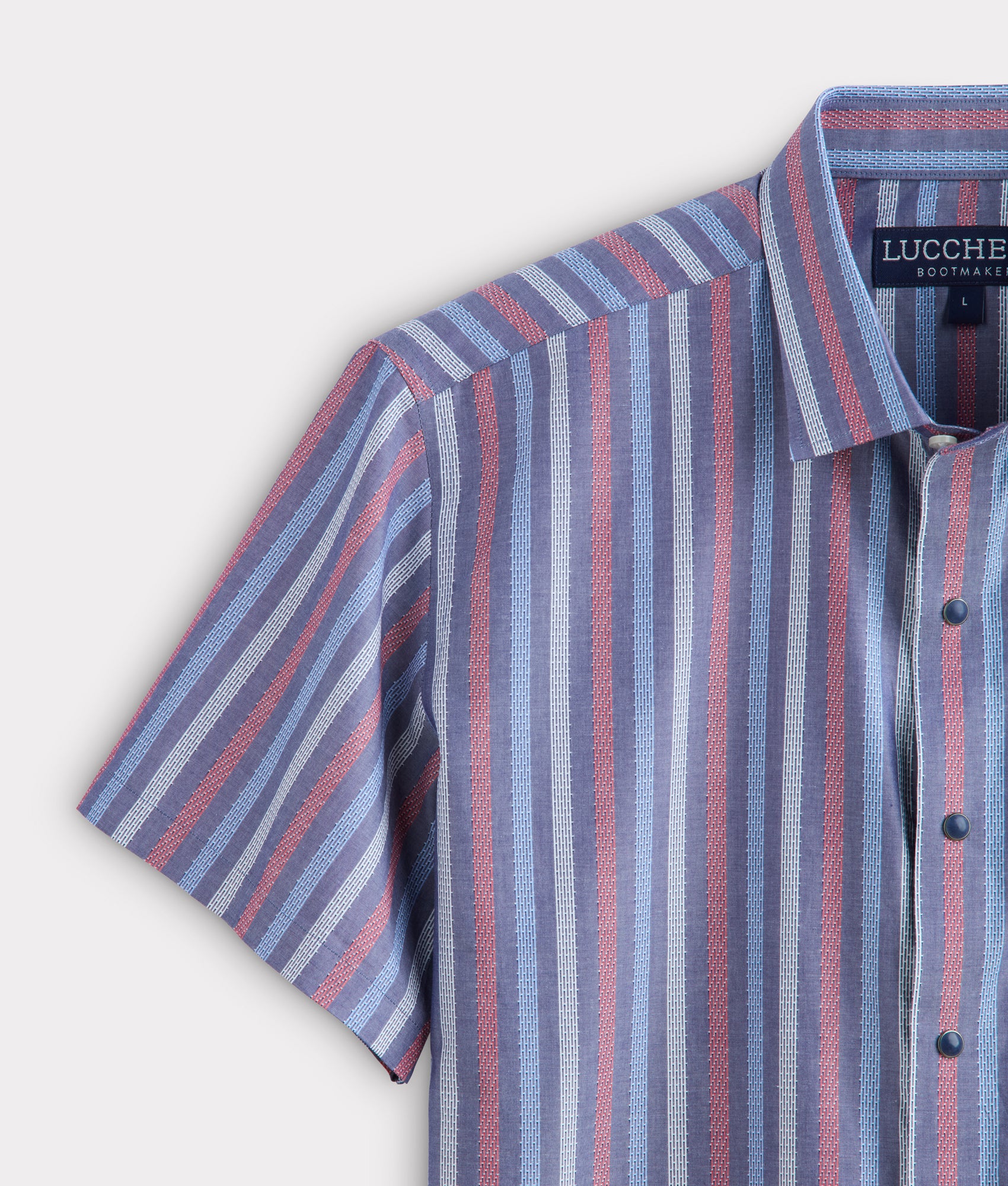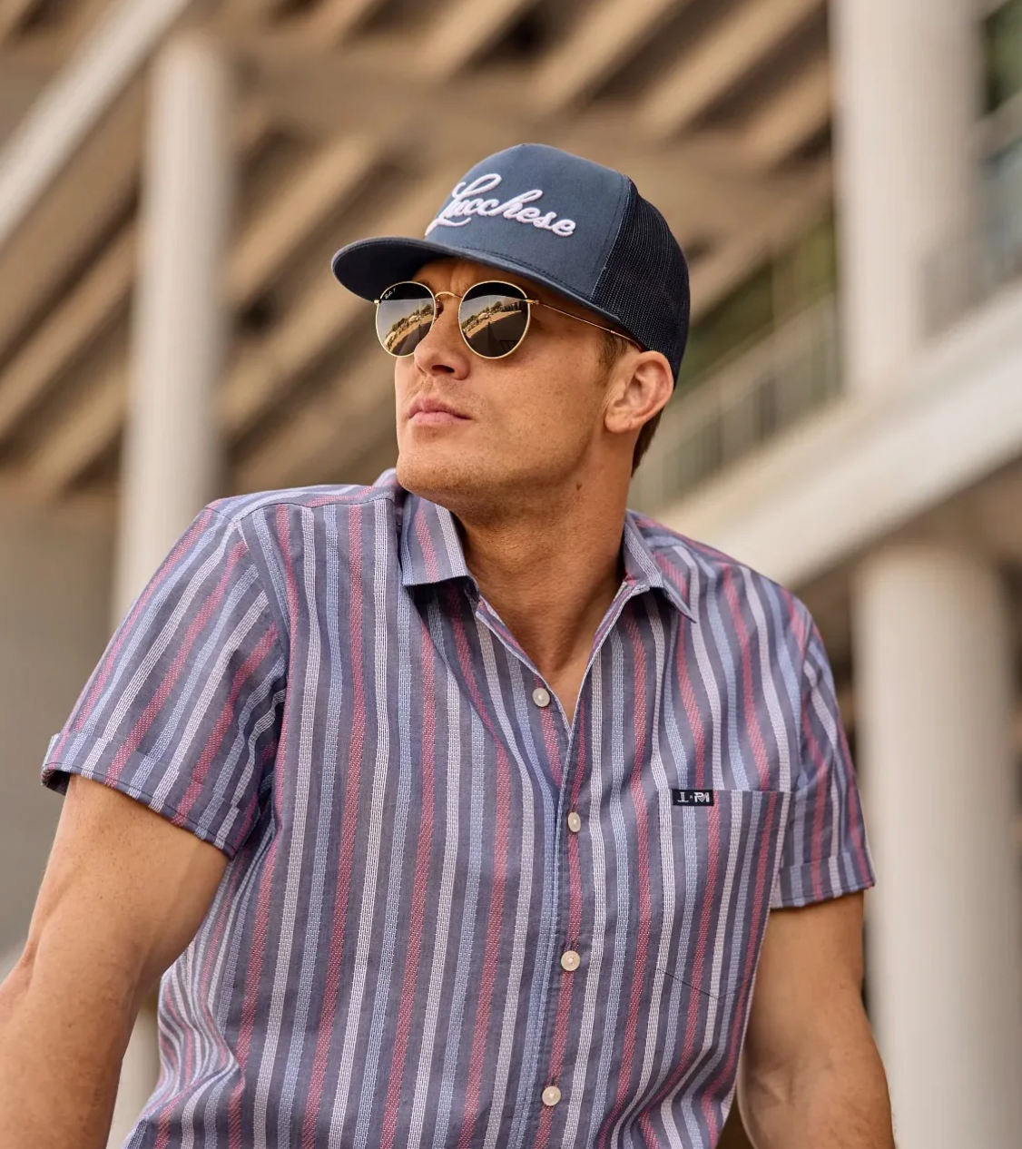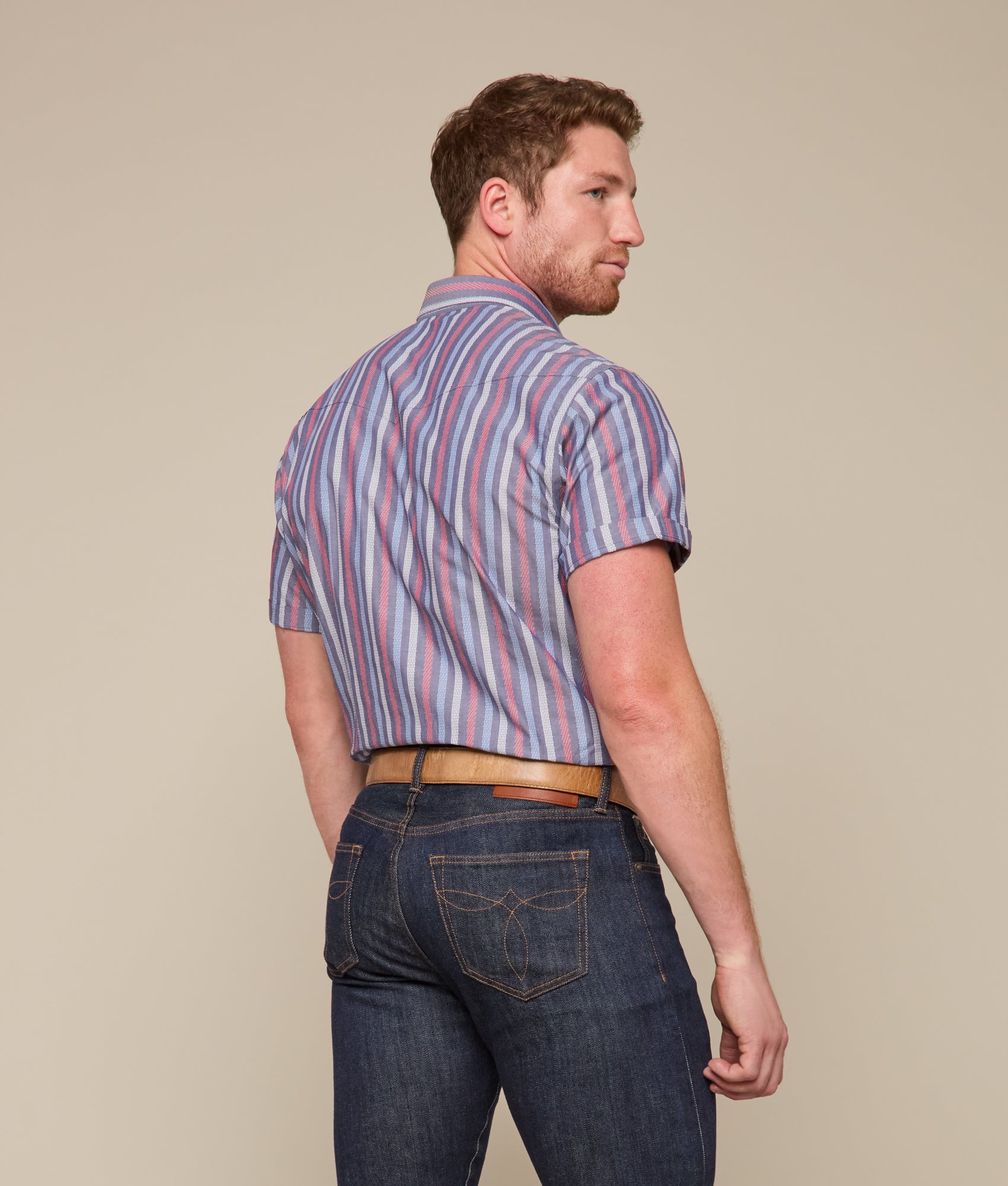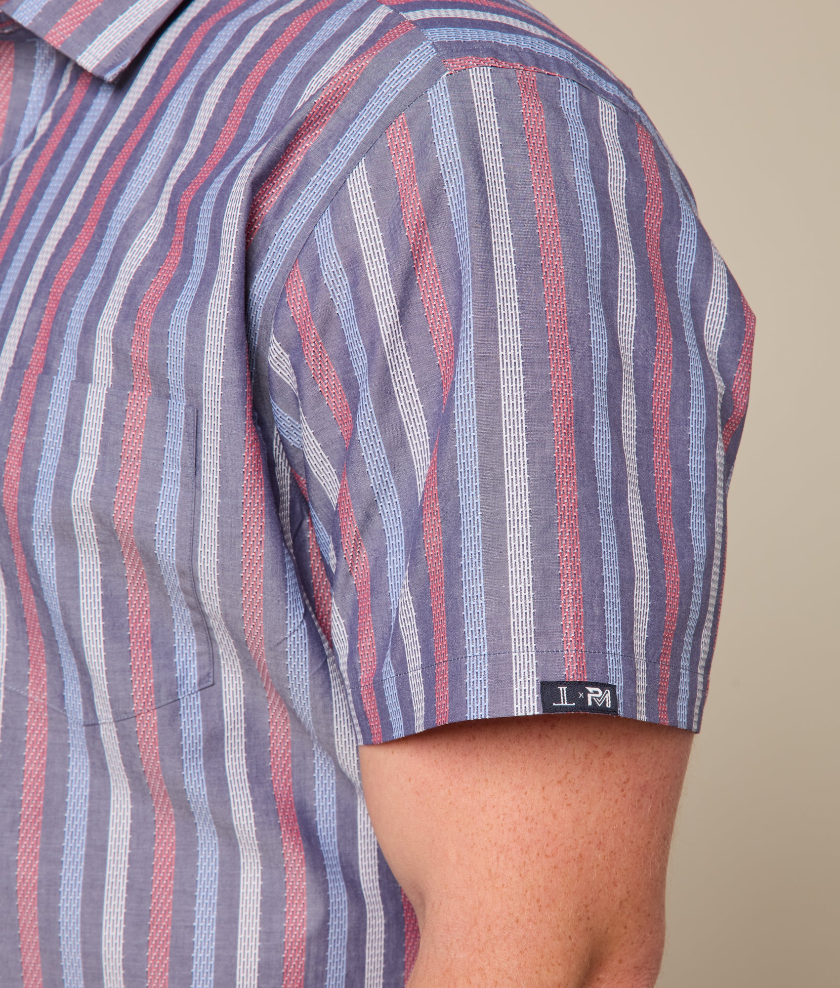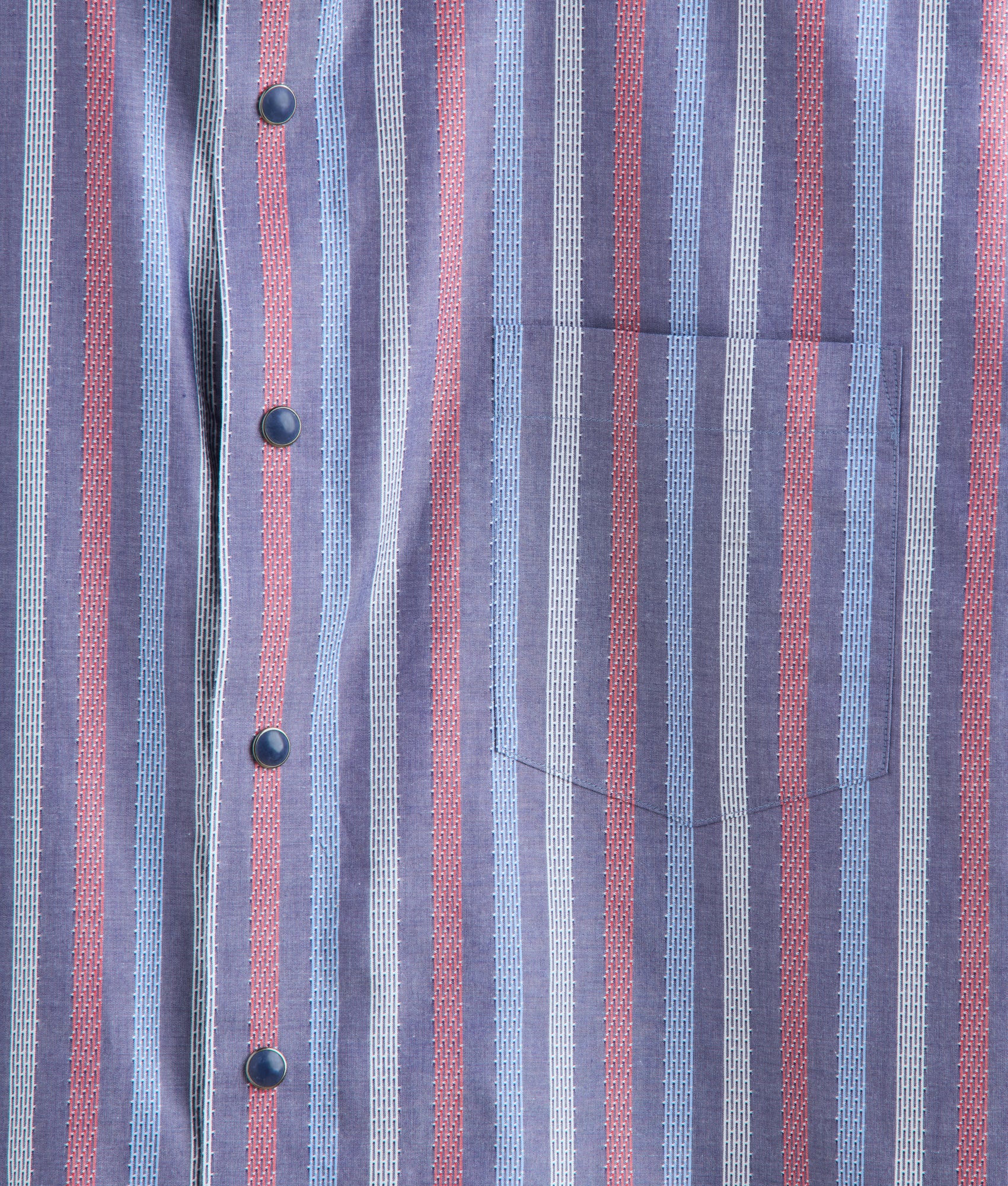 Part of the Parker McCollum collection. this short-sleeved snap shirt captures the heart of country cool. Known for his raw sound and honest lyrics. Parker brings that same authenticity to his signature style??laid-back. bold. and unmistakably Texan. This shirt features a standout stripe pattern in rich reds. deep blues. and soft greys that wrap all the way around for a clean. polished look. Parker gravitates toward this piece for its easy fit. classic western snaps. and colors echoing his music’s Texas roots. It’s the kind of shirt you can wear from the stage to the back porch??and everywhere in between.