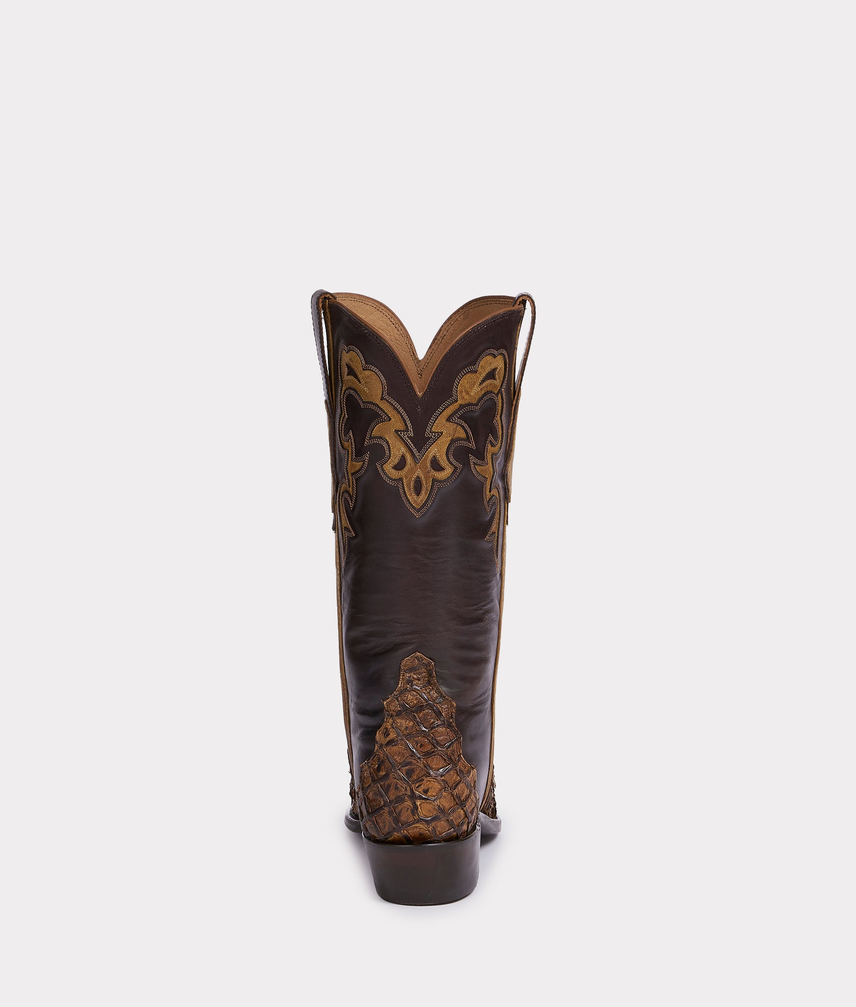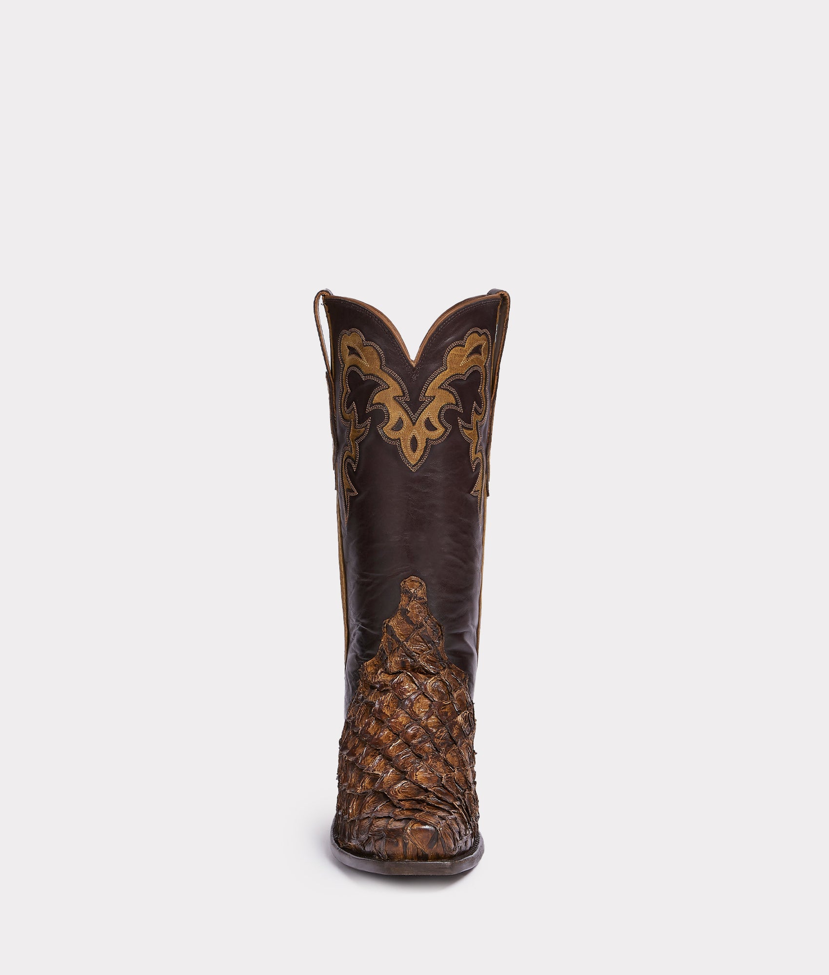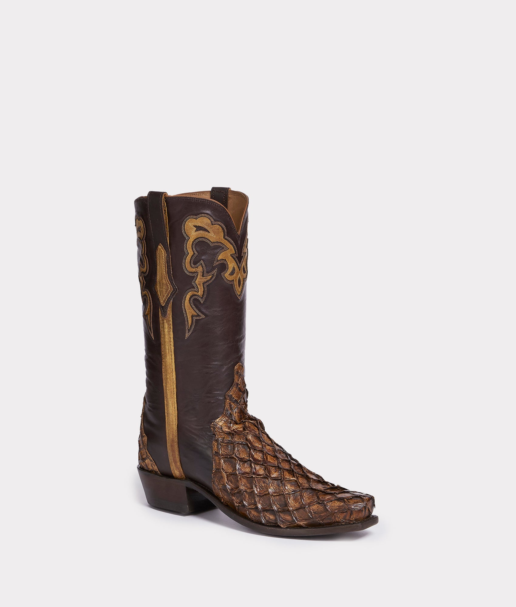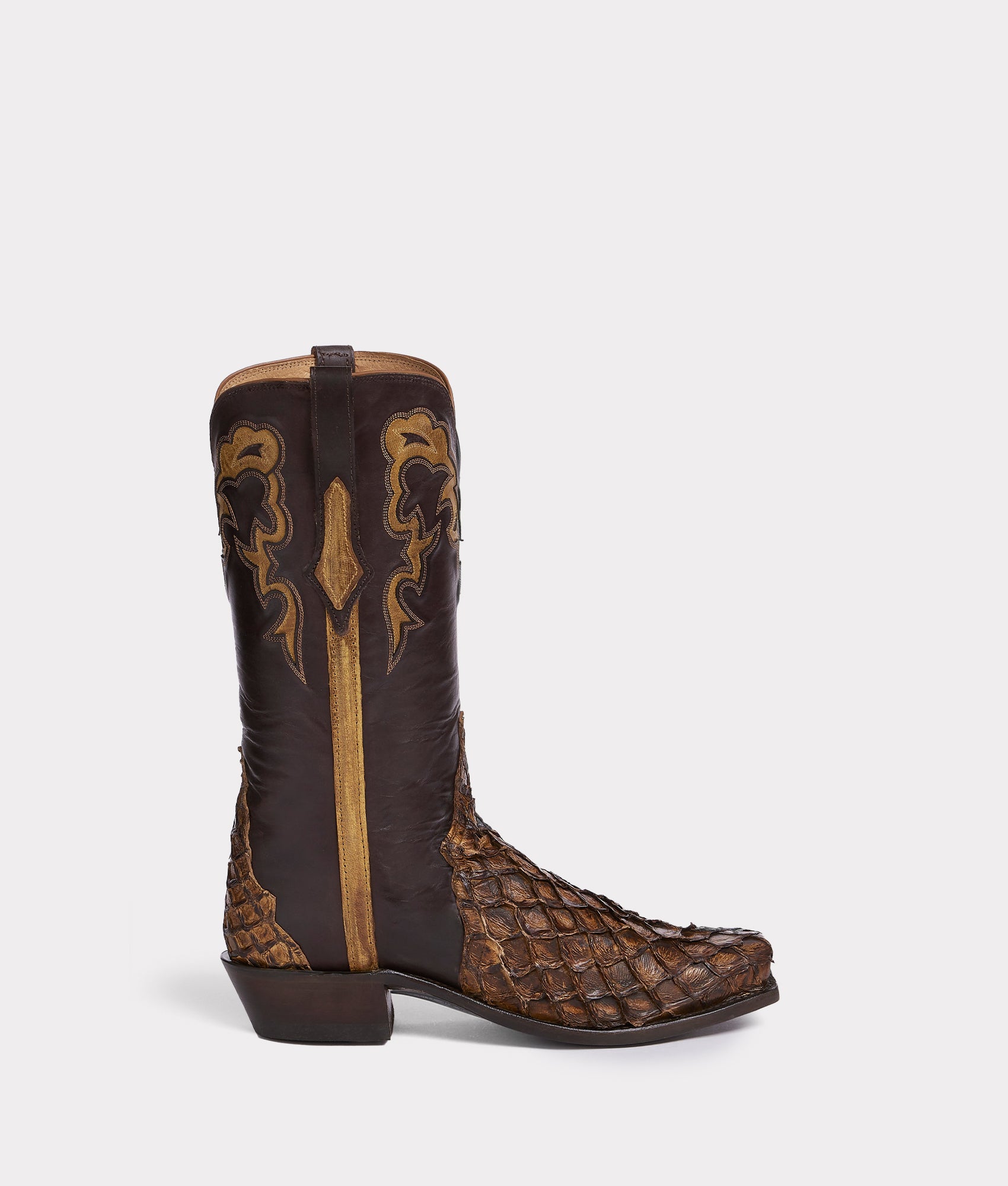 New-World style meets Old-World techniques. Bearing the name and legacy of an early 19th-century homestead pioneered by Lee Clary. the Narcisso pays homage to the American West and the Texas cowboy. Handcrafted from Mini Pirarucu fish skin and Ranch Hand leather. Narcisso is saturated by Texas Panhandle hues – coming in three natural colorways. From clean lines to smooth edges. the vintage Matador silhouette is rendered to perfection. Family values and traditional cowboy principles are rooted in Narcisso’s core. Handmade in Texas.