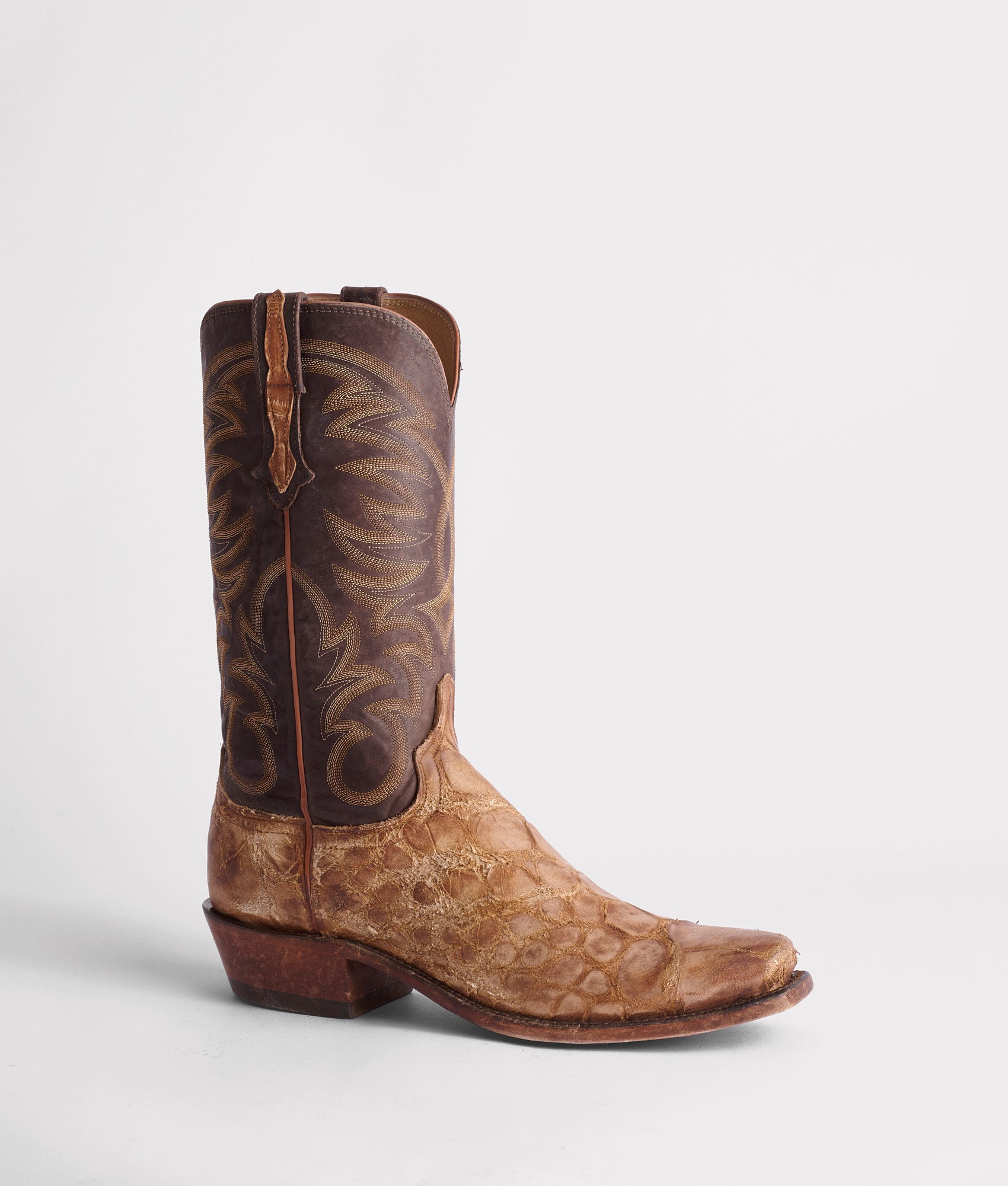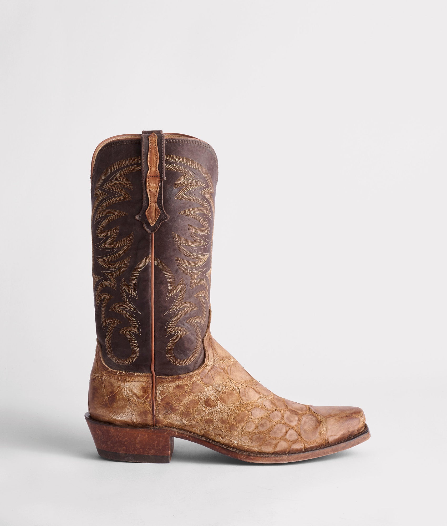 Benchmade by our coveted Texas artisans. the Rodney is a Western-styled boot crafted from wild-caught Giant Alligator leather. The vamp and quarter hues are unified by a 10-year stonewash patina and contrasting stitch pattern. Saddle ready. Life ready. Handmade in Texas.