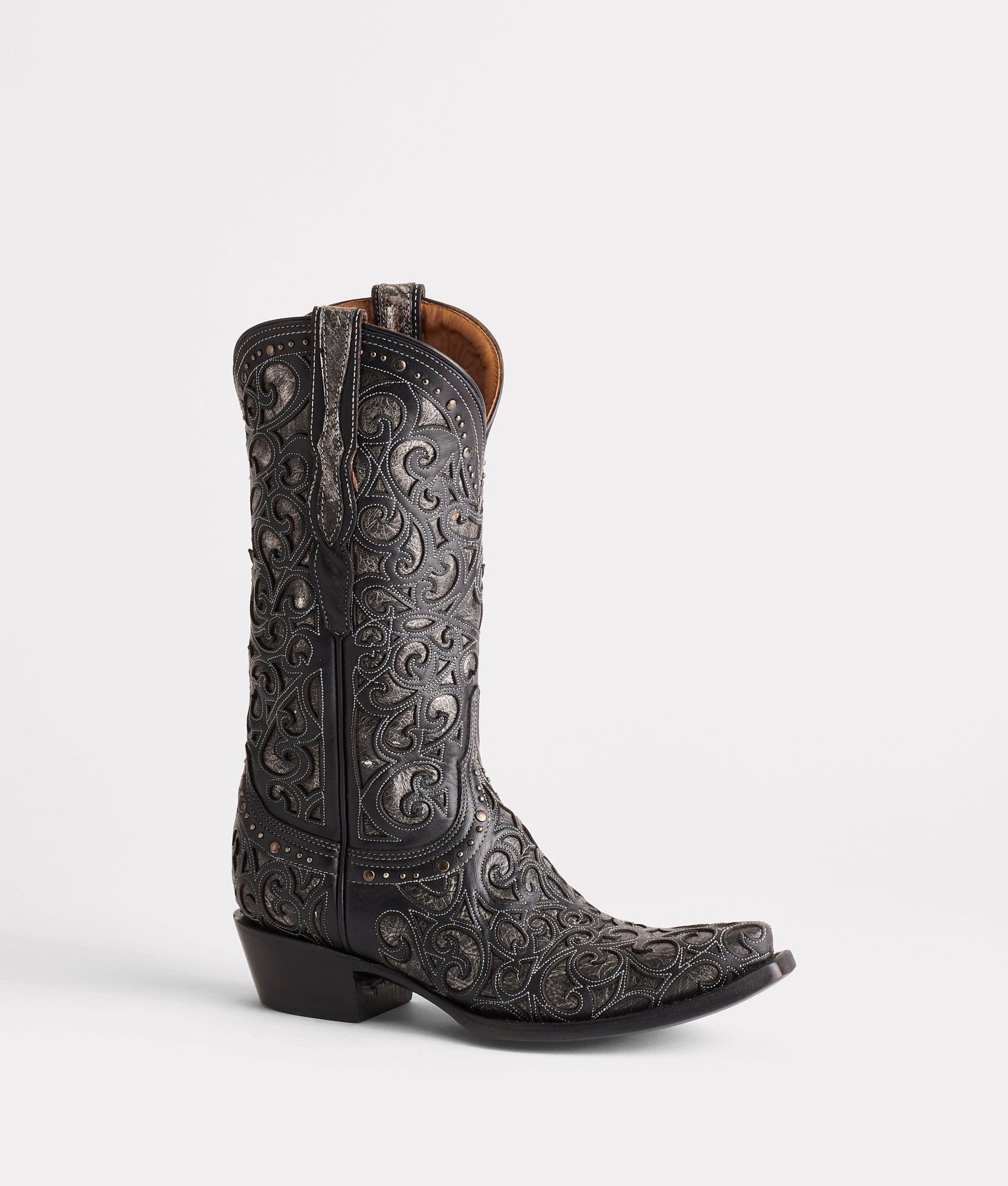 Sierra is a traditional Western boot with elaborate spirals laser cut onto the quarter and vamp. A thoughtfully brass-studded crown and collar add an element of sparkle to the cowgirls repertoire.