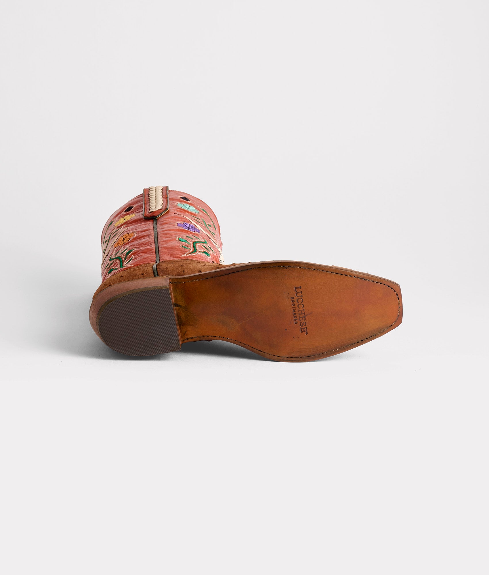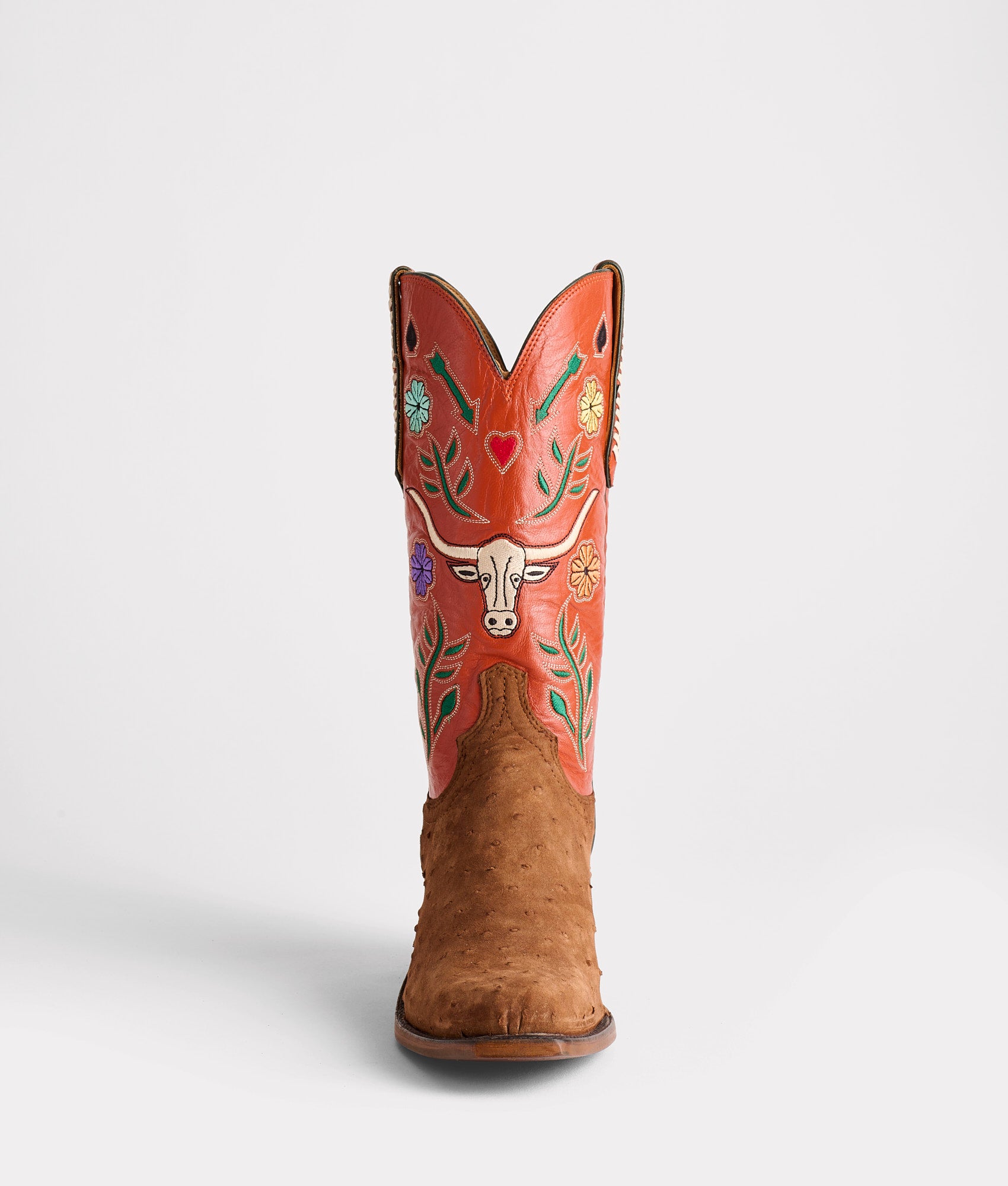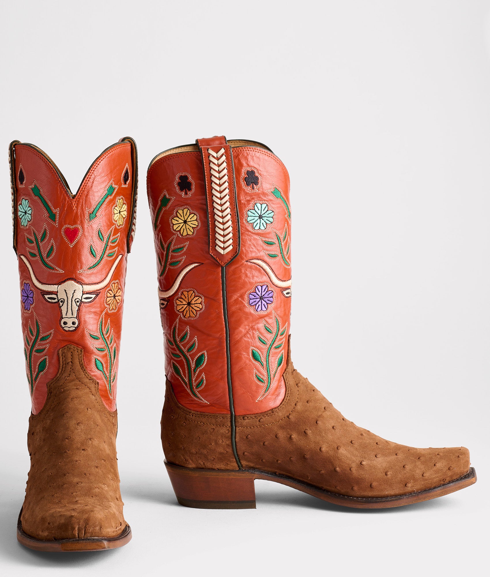 Straight Shooter doesn’t waste words. and neither does its design. The muralled western silhouette speaks through fully-stitched motifs that stretch across the quarters. instilling nostalgia. The Cabrera stitch on the upper and the Gallardo band along the scallop nod to the vintage Texan—wildflowers. wild cattle. and wild cards. Over the last three years. our Product Development Team has perfected a NEW Lucchese leather. Sueded Full Quill Ostrich—velvety like Suede with the distinctive crowns of Ostrich. Every detail of this Straight Shooter gets to the point. from the aesthetic of Ostrich quills to the knife and needle that brought it to life. Straight Shooter is made for the man who knows what he wants. how he wants it. and how he shows up to get it. Handmade in Texas.